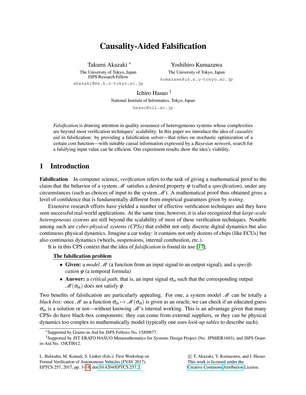 Falsification is drawing attention in quality assurance of heterogeneous systems whose complexities are beyond most verification techniques' scalability. In this paper we introduce the idea of causality aid in falsification: by providing a falsification solver -- that relies on stochastic optimization of a certain cost function -- with suitable causal information expressed by a Bayesian network, search for a falsifying input value can be efficient. Our experiment results show the idea's viability.