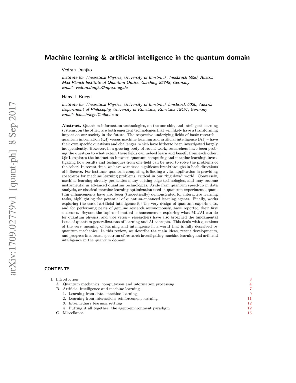 Quantum information technologies, and intelligent learning systems, are both emergent technologies that will likely have a transforming impact on our society. The respective underlying fields of research -- quantum information (QI) versus machine learning (ML) and artificial intelligence (AI) -- have their own specific challenges, which have hitherto been investigated largely independently. However, in a growing body of recent work, researchers have been probing the question to what extent these fields can learn and benefit from each other. QML explores the interaction between quantum computing and ML, investigating how results and techniques from one field can be used to solve the problems of the other. Recently, we have witnessed breakthroughs in both directions of influence. For instance, quantum computing is finding a vital application in providing speed-ups in ML, critical in our "big data" world. Conversely, ML already permeates cutting-edge technologies, and may become instrumental in advanced quantum technologies. Aside from quantum speed-up in data analysis, or classical ML optimization used in quantum experiments, quantum enhancements have also been demonstrated for interactive learning, highlighting the potential of quantum-enhanced learning agents. Finally, works exploring the use of AI for the very design of quantum experiments, and for performing parts of genuine research autonomously, have reported their first successes. Beyond the topics of mutual enhancement, researchers have also broached the fundamental issue of quantum generalizations of ML/AI concepts. This deals with questions of the very meaning of learning and intelligence in a world that is described by quantum mechanics. In this review, we describe the main ideas, recent developments, and progress in a broad spectrum of research investigating machine learning and artificial intelligence in the quantum domain.
