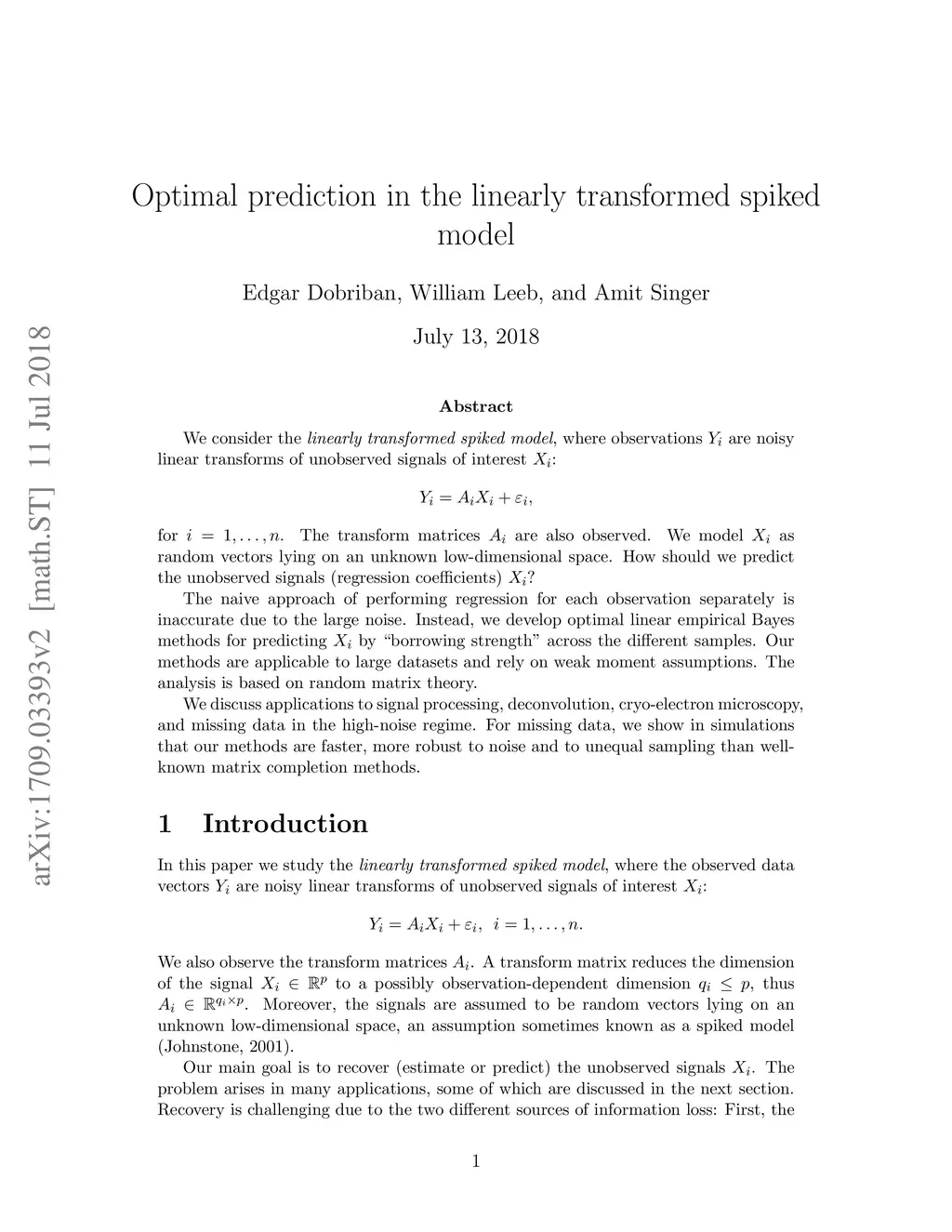 We consider the linearly transformed spiked model, where observations are noisy linear transforms of unobserved signals of interest : \begin{align*} Y_i = A_i X_i + \varepsilon_i, \end{align*} for . The transform matrices are also observed. We model as random vectors lying on an unknown low-dimensional space. How should we predict the unobserved signals (regression coefficients) ? The naive approach of performing regression for each observation separately is inaccurate due to the large noise. Instead, we develop optimal linear empirical Bayes methods for predicting by "borrowing strength" across the different samples. Our methods are applicable to large datasets and rely on weak moment assumptions. The analysis is based on random matrix theory. We discuss applications to signal processing, deconvolution, cryo-electron microscopy, and missing data in the high-noise regime. For missing data, we show in simulations that our methods are faster, more robust to noise and to unequal sampling than well-known matrix completion methods.