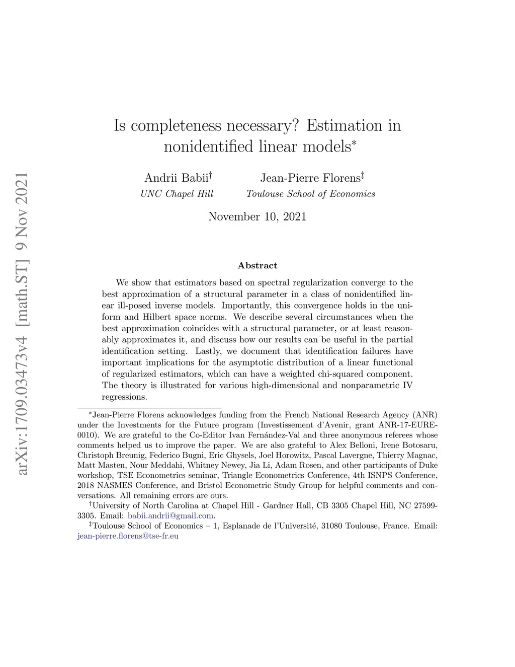 Modern data analysis depends increasingly on estimating models via flexible high-dimensional or nonparametric machine learning methods, where the identification of structural parameters is often challenging and untestable. In linear settings, this identification hinges on the completeness condition, which requires the nonsingularity of a high-dimensional matrix or operator and may fail for finite samples or even at the population level. Regularized estimators provide a solution by enabling consistent estimation of structural or average structural functions, sometimes even under identification failure. We show that the asymptotic distribution in these cases can be nonstandard. We develop a comprehensive theory of regularized estimators, which include methods such as high-dimensional ridge regularization, gradient descent, and principal component analysis (PCA). The results are illustrated for high-dimensional and nonparametric instrumental variable regressions and are supported through simulation experiments.