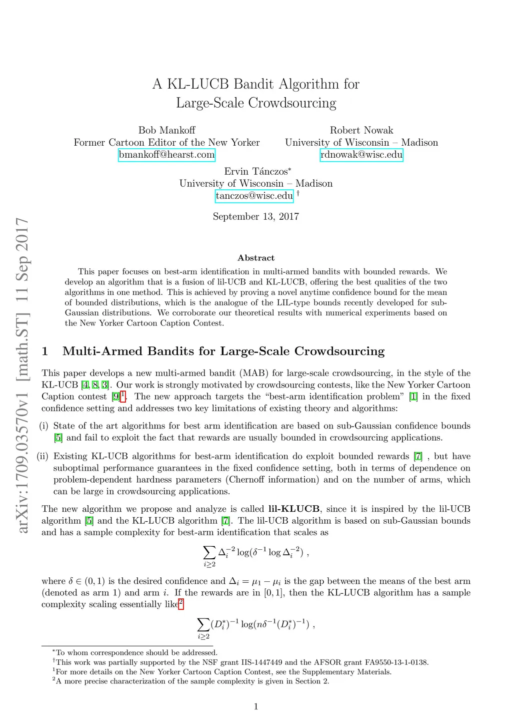 A KL-LUCB Bandit Algorithm for Large-Scale Crowdsourcing