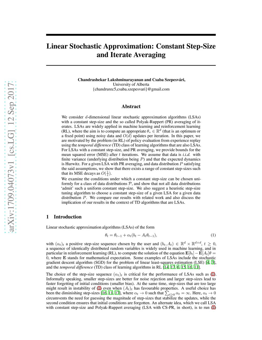 We consider -dimensional linear stochastic approximation algorithms (LSAs) with a constant step-size and the so called Polyak-Ruppert (PR) averaging of iterates. LSAs are widely applied in machine learning and reinforcement learning (RL), where the aim is to compute an appropriate (that is an optimum or a fixed point) using noisy data and updates per iteration. In this paper, we are motivated by the problem (in RL) of policy evaluation from experience replay using the \emph{temporal difference} (TD) class of learning algorithms that are also LSAs. For LSAs with a constant step-size, and PR averaging, we provide bounds for the mean squared error (MSE) after iterations. We assume that data is \iid with finite variance (underlying distribution being ) and that the expected dynamics is Hurwitz. For a given LSA with PR averaging, and data distribution satisfying the said assumptions, we show that there exists a range of constant step-sizes such that its MSE decays as . We examine the conditions under which a constant step-size can be chosen uniformly for a class of data distributions , and show that not all data distributions `admit' such a uniform constant step-size. We also suggest a heuristic step-size tuning algorithm to choose a constant step-size of a given LSA for a given data distribution . We compare our results with related work and also discuss the implication of our results in the context of TD algorithms that are LSAs.