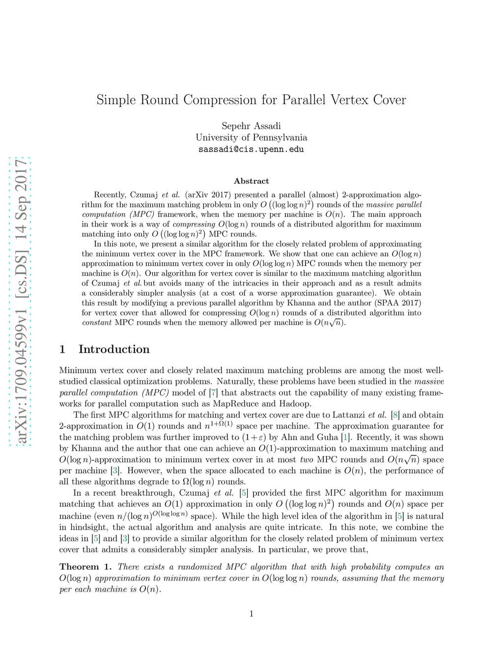 Recently, Czumaj et.al. (arXiv 2017) presented a parallel (almost) -approximation algorithm for the maximum matching problem in only rounds of the massive parallel computation (MPC) framework, when the memory per machine is . The main approach in their work is a way of compressing rounds of a distributed algorithm for maximum matching into only MPC rounds. In this note, we present a similar algorithm for the closely related problem of approximating the minimum vertex cover in the MPC framework. We show that one can achieve an approximation to minimum vertex cover in only MPC rounds when the memory per machine is . Our algorithm for vertex cover is similar to the maximum matching algorithm of Czumaj et.al. but avoids many of the intricacies in their approach and as a result admits a considerably simpler analysis (at a cost of a worse approximation guarantee). We obtain this result by modifying a previous parallel algorithm by Khanna and the author (SPAA 2017) for vertex cover that allowed for compressing rounds of a distributed algorithm into constant MPC rounds when the memory allowed per machine is .