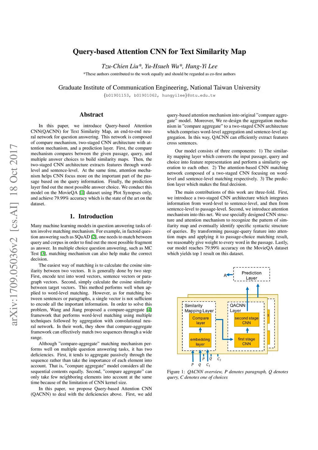 In this paper, we introduce Query-based Attention CNN(QACNN) for Text Similarity Map, an end-to-end neural network for question answering. This network is composed of compare mechanism, two-staged CNN architecture with attention mechanism, and a prediction layer. First, the compare mechanism compares between the given passage, query, and multiple answer choices to build similarity maps. Then, the two-staged CNN architecture extracts features through word-level and sentence-level. At the same time, attention mechanism helps CNN focus more on the important part of the passage based on the query information. Finally, the prediction layer find out the most possible answer choice. We conduct this model on the MovieQA dataset using Plot Synopses only, and achieve 79.99% accuracy which is the state of the art on the dataset.
