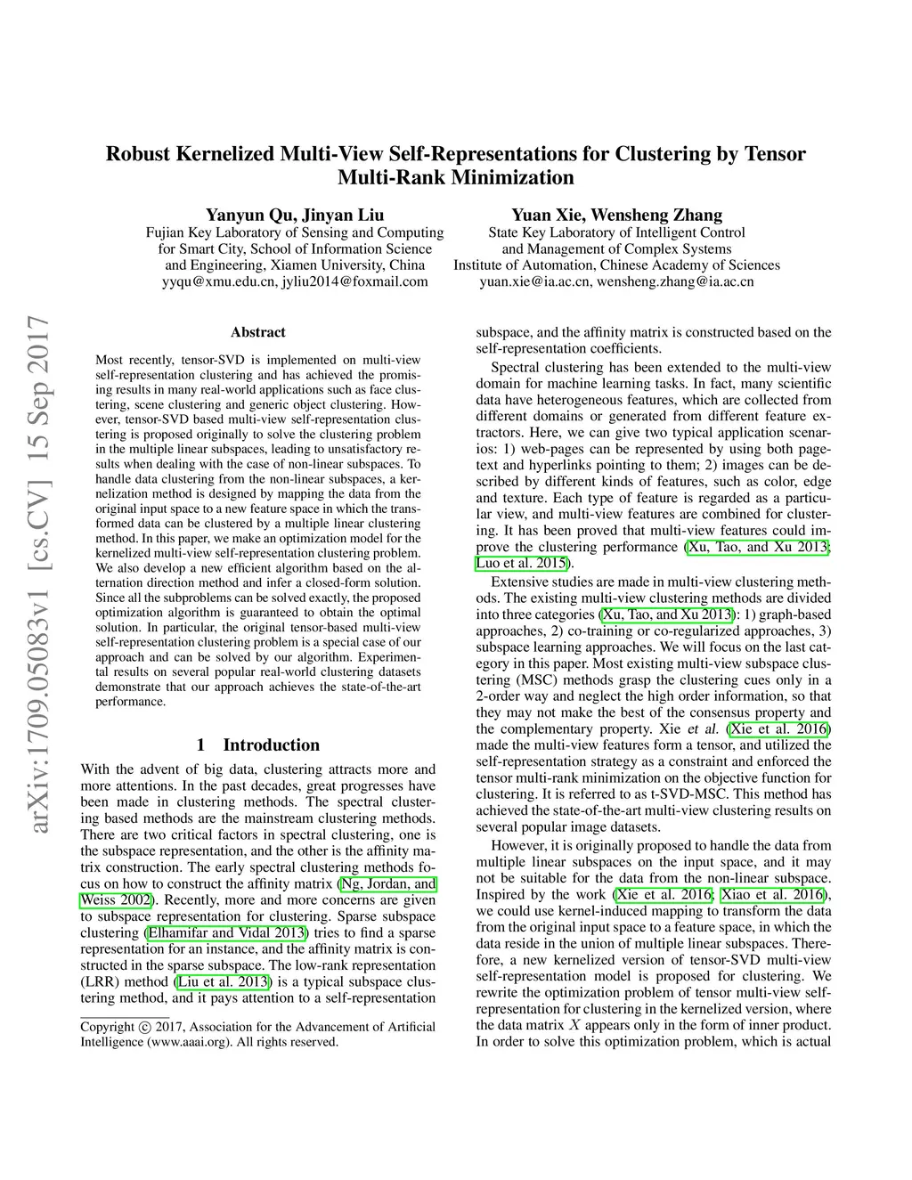 Most recently, tensor-SVD is implemented on multi-view self-representation clustering and has achieved the promising results in many real-world applications such as face clustering, scene clustering and generic object clustering. However, tensor-SVD based multi-view self-representation clustering is proposed originally to solve the clustering problem in the multiple linear subspaces, leading to unsatisfactory results when dealing with the case of non-linear subspaces. To handle data clustering from the non-linear subspaces, a kernelization method is designed by mapping the data from the original input space to a new feature space in which the transformed data can be clustered by a multiple linear clustering method. In this paper, we make an optimization model for the kernelized multi-view self-representation clustering problem. We also develop a new efficient algorithm based on the alternation direction method and infer a closed-form solution. Since all the subproblems can be solved exactly, the proposed optimization algorithm is guaranteed to obtain the optimal solution. In particular, the original tensor-based multi-view self-representation clustering problem is a special case of our approach and can be solved by our algorithm. Experimental results on several popular real-world clustering datasets demonstrate that our approach achieves the state-of-the-art performance.