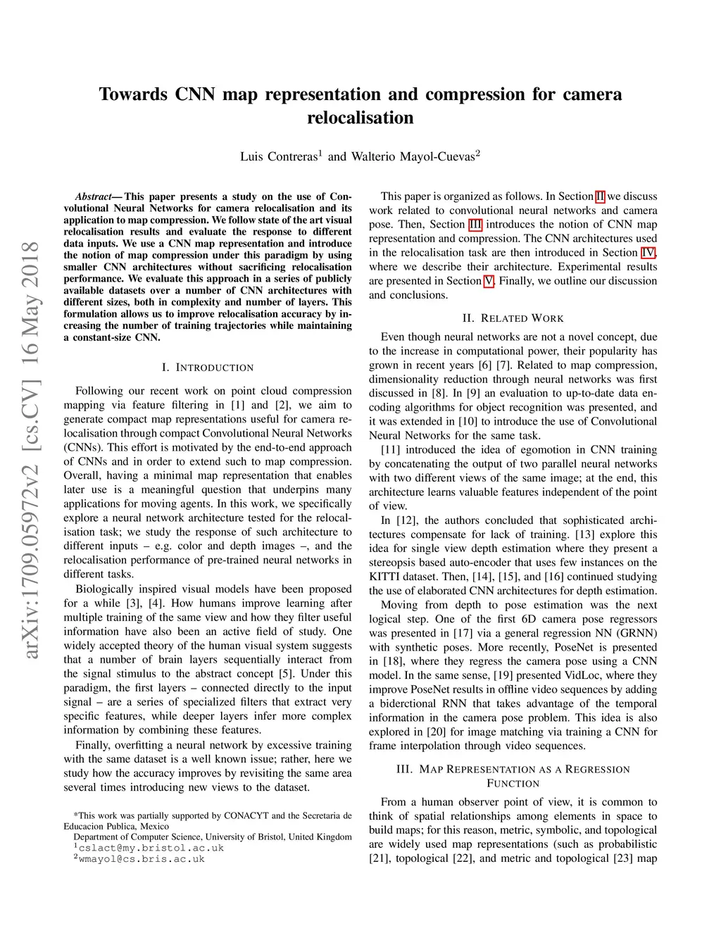 This paper presents a study on the use of Convolutional Neural Networks for camera relocalisation and its application to map compression. We follow state of the art visual relocalisation results and evaluate the response to different data inputs. We use a CNN map representation and introduce the notion of map compression under this paradigm by using smaller CNN architectures without sacrificing relocalisation performance. We evaluate this approach in a series of publicly available datasets over a number of CNN architectures with different sizes, both in complexity and number of layers. This formulation allows us to improve relocalisation accuracy by increasing the number of training trajectories while maintaining a constant-size CNN.