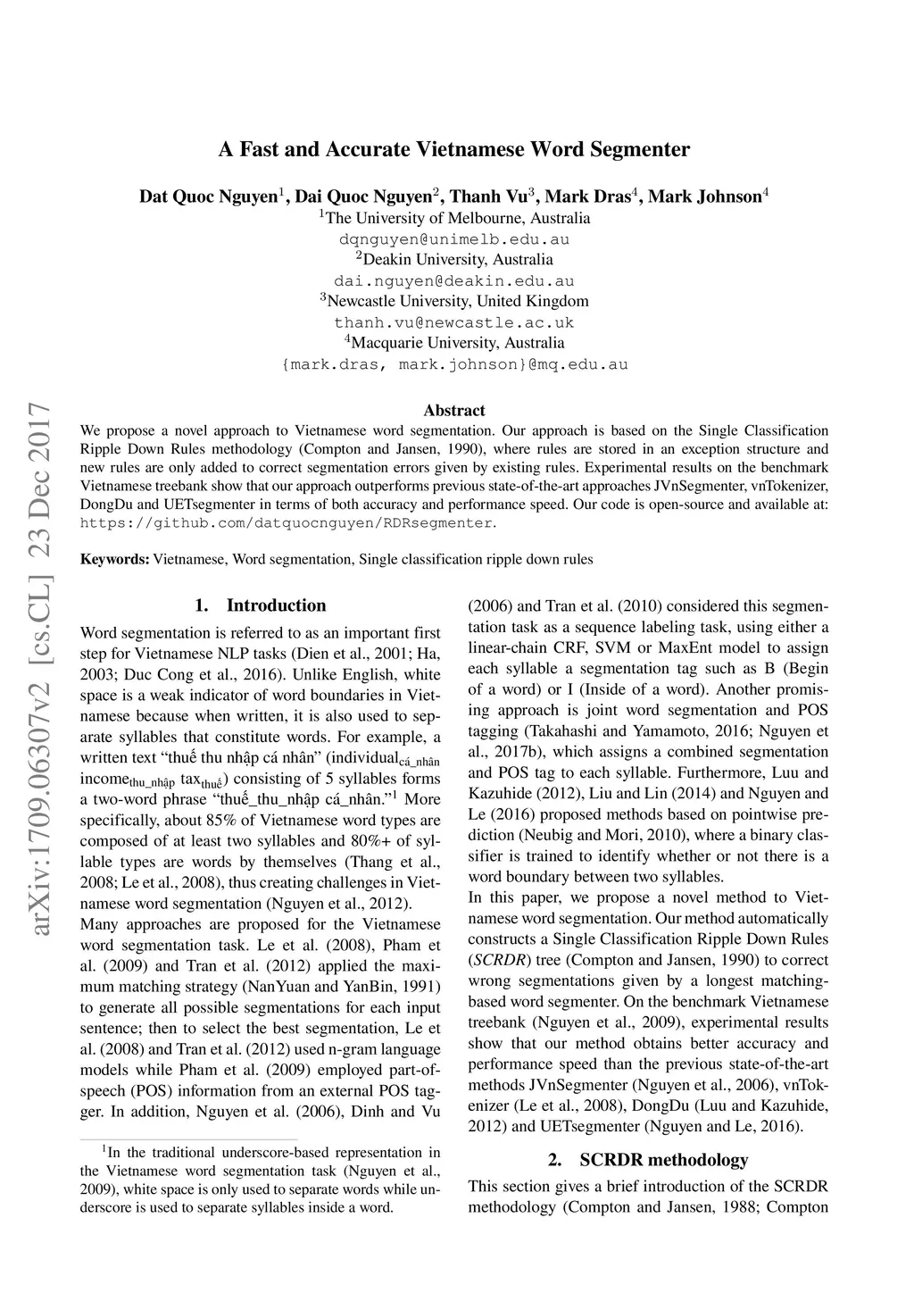 We propose a novel approach to Vietnamese word segmentation. Our approach is based on the Single Classification Ripple Down Rules methodology (Compton and Jansen, 1990), where rules are stored in an exception structure and new rules are only added to correct segmentation errors given by existing rules. Experimental results on the benchmark Vietnamese treebank show that our approach outperforms previous state-of-the-art approaches JVnSegmenter, vnTokenizer, DongDu and UETsegmenter in terms of both accuracy and performance speed. Our code is open-source and available at: https://github.com/datquocnguyen/RDRsegmenter.