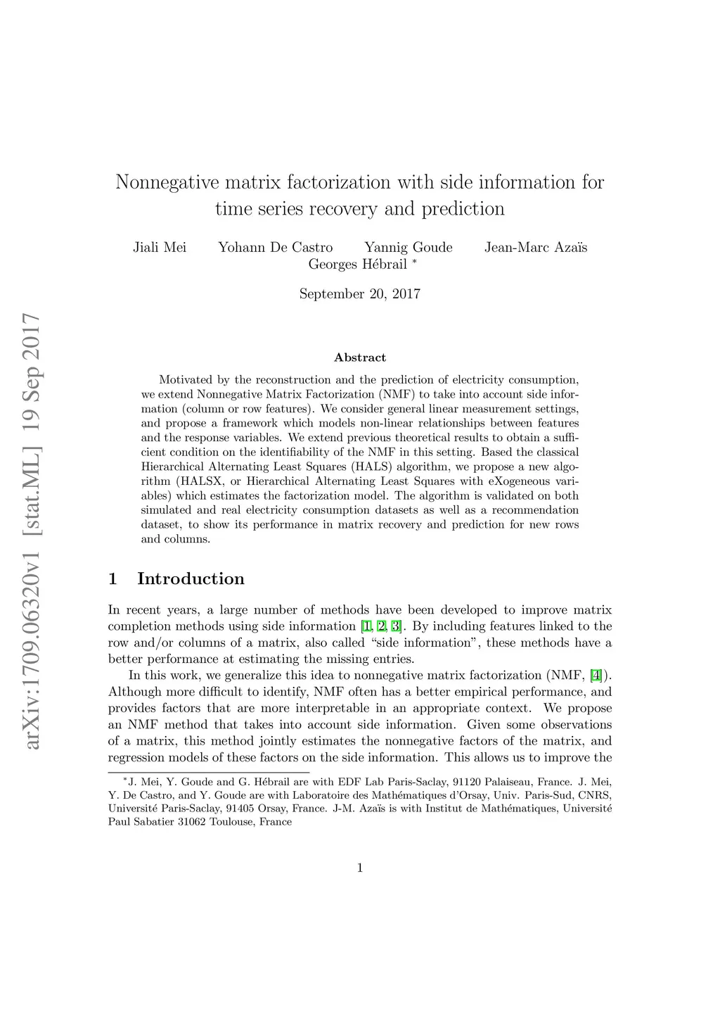 Motivated by the reconstruction and the prediction of electricity consumption, we extend Nonnegative Matrix Factorization~(NMF) to take into account side information (column or row features). We consider general linear measurement settings, and propose a framework which models non-linear relationships between features and the response variables. We extend previous theoretical results to obtain a sufficient condition on the identifiability of the NMF in this setting. Based the classical Hierarchical Alternating Least Squares~(HALS) algorithm, we propose a new algorithm (HALSX, or Hierarchical Alternating Least Squares with eXogeneous variables) which estimates the factorization model. The algorithm is validated on both simulated and real electricity consumption datasets as well as a recommendation dataset, to show its performance in matrix recovery and prediction for new rows and columns.