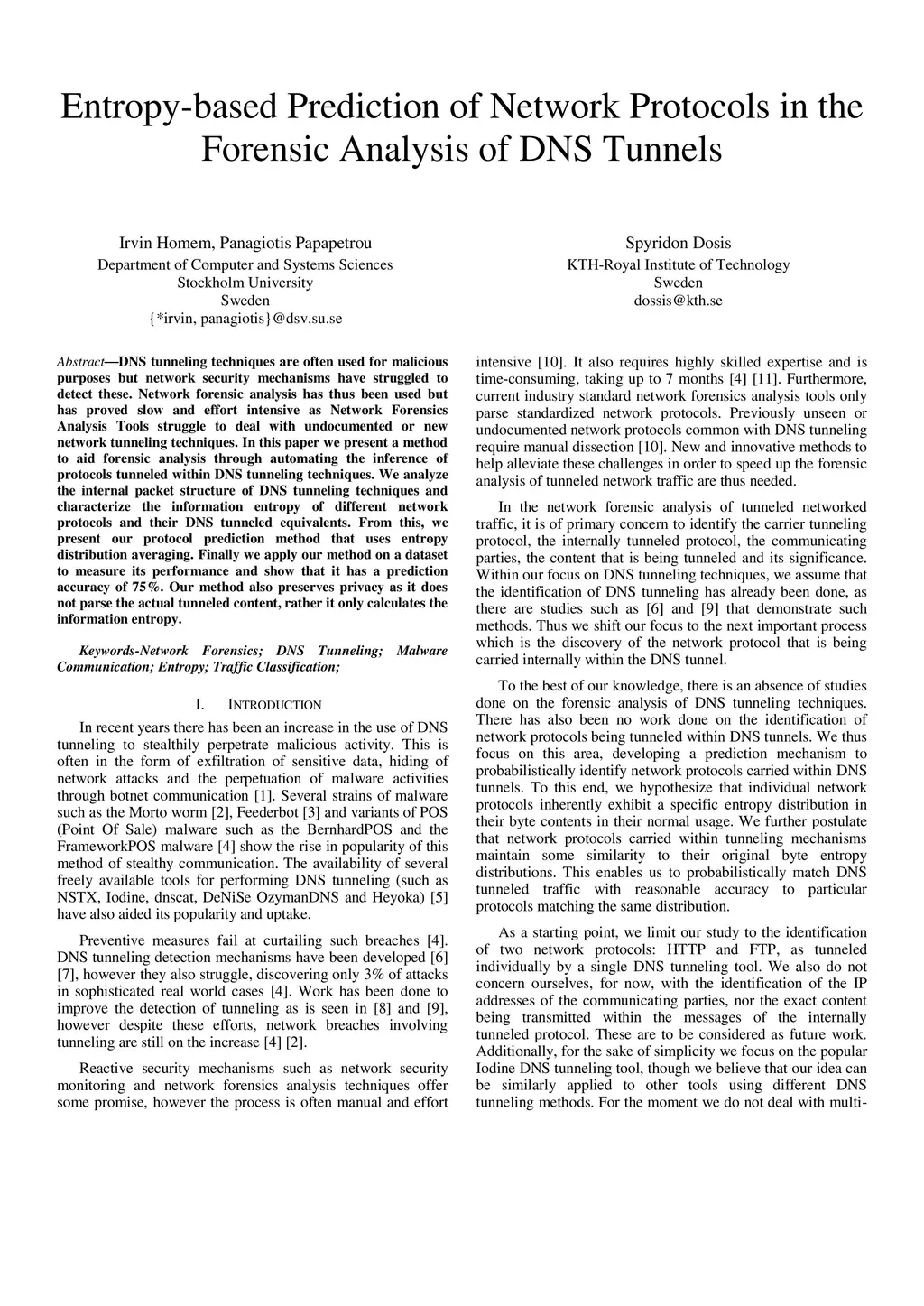 DNS tunneling techniques are often used for malicious purposes but network security mechanisms have struggled to detect these. Network forensic analysis has thus been used but has proved slow and effort intensive as Network Forensics Analysis Tools struggle to deal with undocumented or new network tunneling techniques. In this paper we present a method to aid forensic analysis through automating the inference of protocols tunneled within DNS tunneling techniques. We analyze the internal packet structure of DNS tunneling techniques and characterize the information entropy of different network protocols and their DNS tunneled equivalents. From this, we present our protocol prediction method that uses entropy distribution averaging. Finally we apply our method on a dataset to measure its performance and show that it has a prediction accuracy of 75%. Our method also preserves privacy as it does not parse the actual tunneled content, rather it only calculates the information entropy.