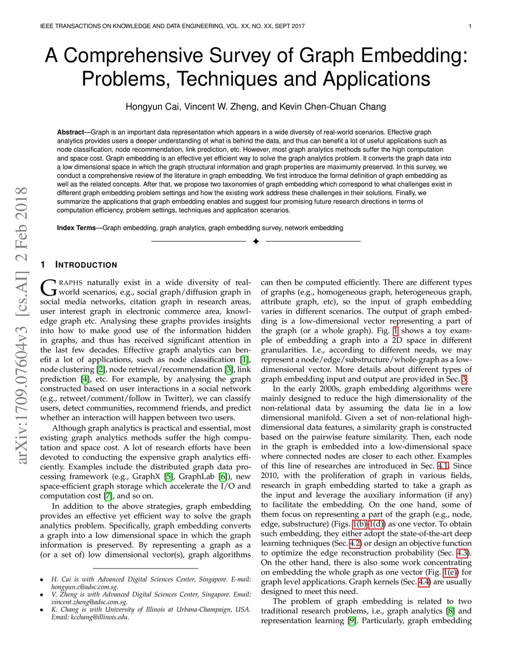 Graph is an important data representation which appears in a wide diversity of real-world scenarios. Effective graph analytics provides users a deeper understanding of what is behind the data, and thus can benefit a lot of useful applications such as node classification, node recommendation, link prediction, etc. However, most graph analytics methods suffer the high computation and space cost. Graph embedding is an effective yet efficient way to solve the graph analytics problem. It converts the graph data into a low dimensional space in which the graph structural information and graph properties are maximally preserved. In this survey, we conduct a comprehensive review of the literature in graph embedding. We first introduce the formal definition of graph embedding as well as the related concepts. After that, we propose two taxonomies of graph embedding which correspond to what challenges exist in different graph embedding problem settings and how the existing work address these challenges in their solutions. Finally, we summarize the applications that graph embedding enables and suggest four promising future research directions in terms of computation efficiency, problem settings, techniques and application scenarios.