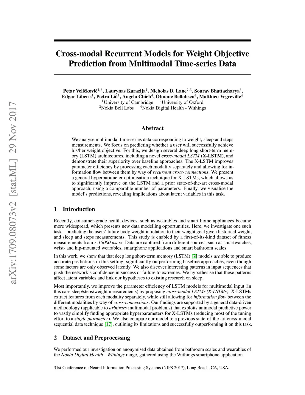 We analyse multimodal time-series data corresponding to weight, sleep and steps measurements. We focus on predicting whether a user will successfully achieve his/her weight objective. For this, we design several deep long short-term memory (LSTM) architectures, including a novel cross-modal LSTM (X-LSTM), and demonstrate their superiority over baseline approaches. The X-LSTM improves parameter efficiency by processing each modality separately and allowing for information flow between them by way of recurrent cross-connections. We present a general hyperparameter optimisation technique for X-LSTMs, which allows us to significantly improve on the LSTM and a prior state-of-the-art cross-modal approach, using a comparable number of parameters. Finally, we visualise the model's predictions, revealing implications about latent variables in this task.