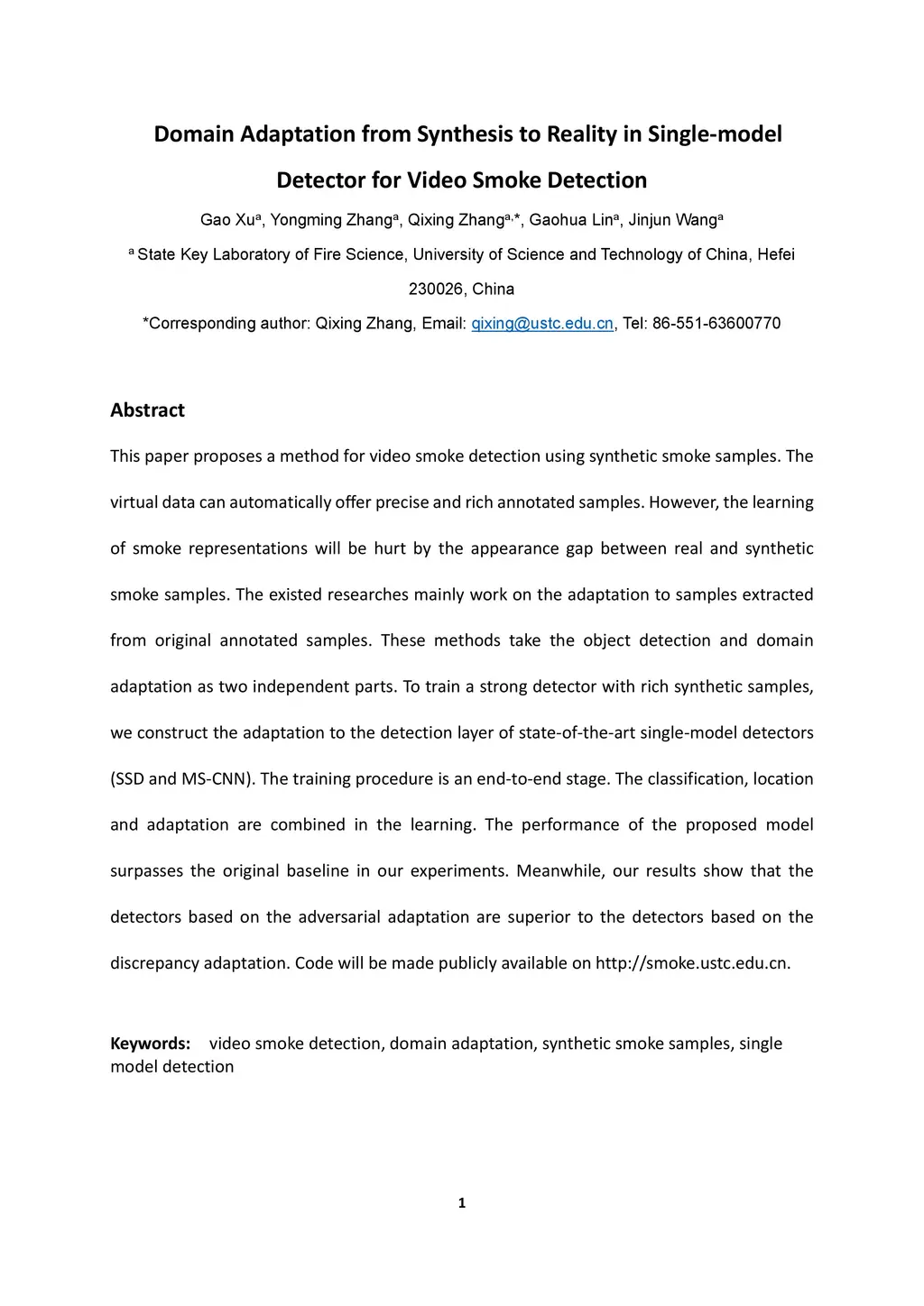 This paper proposes a method for video smoke detection using synthetic smoke samples. The virtual data can automatically offer precise and rich annotated samples. However, the learning of smoke representations will be hurt by the appearance gap between real and synthetic smoke samples. The existed researches mainly work on the adaptation to samples extracted from original annotated samples. These methods take the object detection and domain adaptation as two independent parts. To train a strong detector with rich synthetic samples, we construct the adaptation to the detection layer of state-of-the-art single-model detectors (SSD and MS-CNN). The training procedure is an end-to-end stage. The classification, location and adaptation are combined in the learning. The performance of the proposed model surpasses the original baseline in our experiments. Meanwhile, our results show that the detectors based on the adversarial adaptation are superior to the detectors based on the discrepancy adaptation. Code will be made publicly available on http://smoke.ustc.edu.cn. Moreover, the domain adaptation for two-stage detector is described in Appendix A.