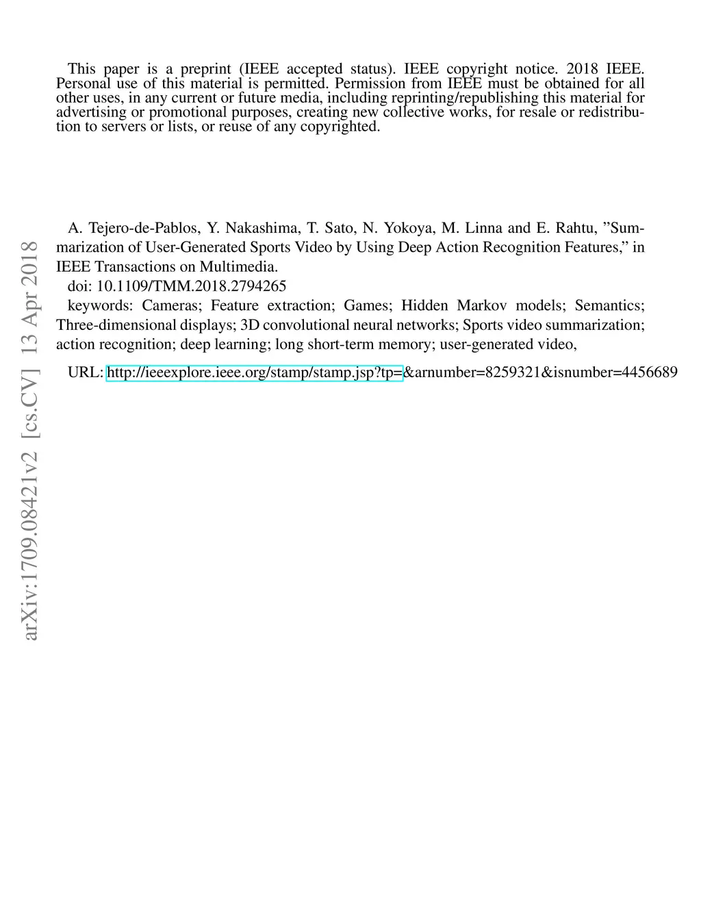 Automatically generating a summary of sports video poses the challenge of detecting interesting moments, or highlights, of a game. Traditional sports video summarization methods leverage editing conventions of broadcast sports video that facilitate the extraction of high-level semantics. However, user-generated videos are not edited, and thus traditional methods are not suitable to generate a summary. In order to solve this problem, this work proposes a novel video summarization method that uses players' actions as a cue to determine the highlights of the original video. A deep neural network-based approach is used to extract two types of action-related features and to classify video segments into interesting or uninteresting parts. The proposed method can be applied to any sports in which games consist of a succession of actions. Especially, this work considers the case of Kendo (Japanese fencing) as an example of a sport to evaluate the proposed method. The method is trained using Kendo videos with ground truth labels that indicate the video highlights. The labels are provided by annotators possessing different experience with respect to Kendo to demonstrate how the proposed method adapts to different needs. The performance of the proposed method is compared with several combinations of different features, and the results show that it outperforms previous summarization methods.