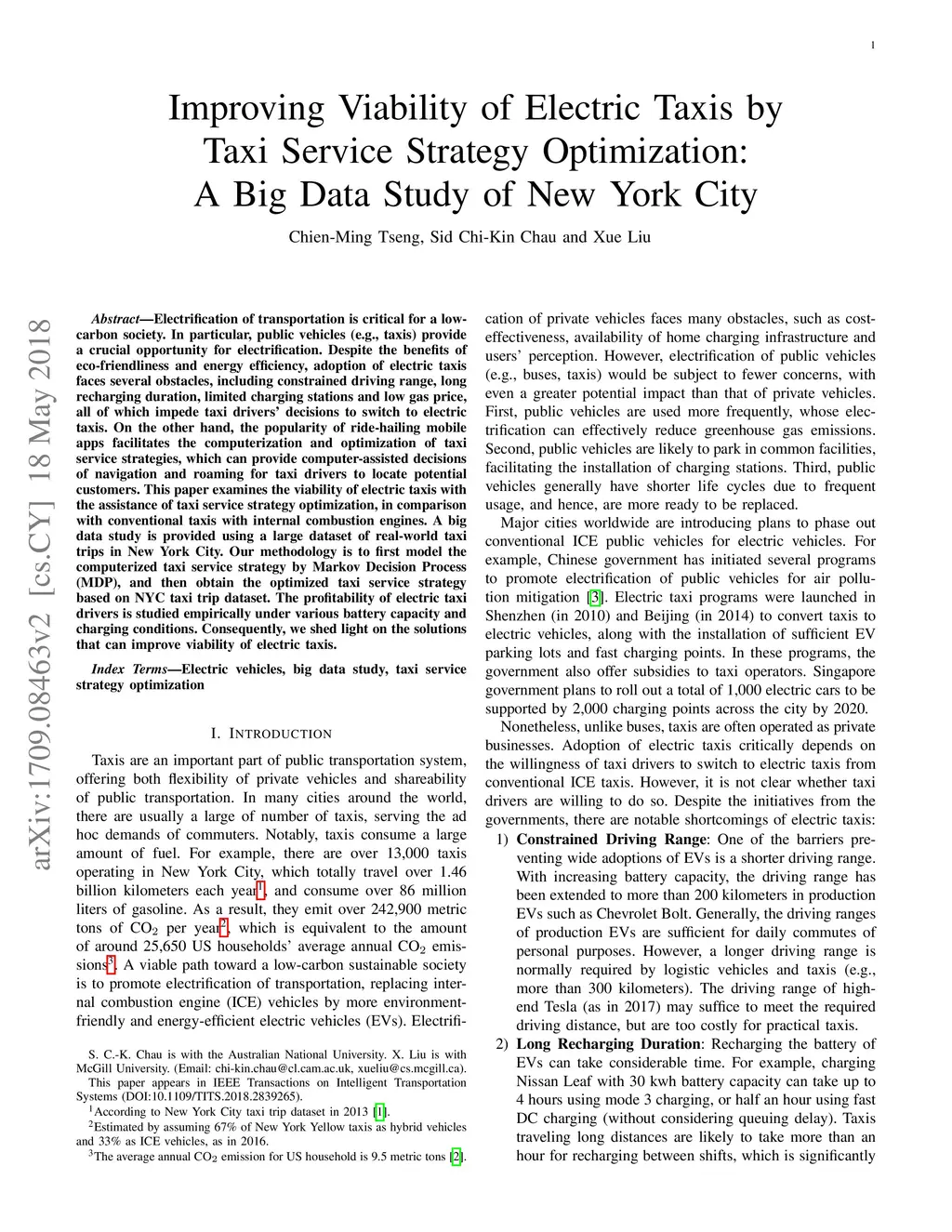 Electrification of transportation is critical for a low-carbon society. In particular, public vehicles (e.g., taxis) provide a crucial opportunity for electrification. Despite the benefits of eco-friendliness and energy efficiency, adoption of electric taxis faces several obstacles, including constrained driving range, long recharging duration, limited charging stations and low gas price, all of which impede taxi drivers' decisions to switch to electric taxis. On the other hand, the popularity of ride-hailing mobile apps facilitates the computerization and optimization of taxi service strategies, which can provide computer-assisted decisions of navigation and roaming for taxi drivers to locate potential customers. This paper examines the viability of electric taxis with the assistance of taxi service strategy optimization, in comparison with conventional taxis with internal combustion engines. A big data study is provided using a large dataset of real-world taxi trips in New York City. Our methodology is to first model the computerized taxi service strategy by Markov Decision Process (MDP), and then obtain the optimized taxi service strategy based on NYC taxi trip dataset. The profitability of electric taxi drivers is studied empirically under various battery capacity and charging conditions. Consequently, we shed light on the solutions that can improve viability of electric taxis.