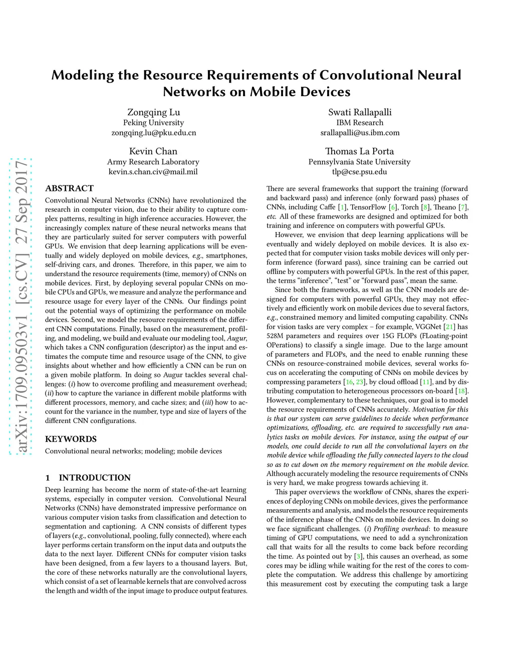 Convolutional Neural Networks (CNNs) have revolutionized the research in computer vision, due to their ability to capture complex patterns, resulting in high inference accuracies. However, the increasingly complex nature of these neural networks means that they are particularly suited for server computers with powerful GPUs. We envision that deep learning applications will be eventually and widely deployed on mobile devices, e.g., smartphones, self-driving cars, and drones. Therefore, in this paper, we aim to understand the resource requirements (time, memory) of CNNs on mobile devices. First, by deploying several popular CNNs on mobile CPUs and GPUs, we measure and analyze the performance and resource usage for every layer of the CNNs. Our findings point out the potential ways of optimizing the performance on mobile devices. Second, we model the resource requirements of the different CNN computations. Finally, based on the measurement, pro ling, and modeling, we build and evaluate our modeling tool, Augur, which takes a CNN configuration (descriptor) as the input and estimates the compute time and resource usage of the CNN, to give insights about whether and how e ciently a CNN can be run on a given mobile platform. In doing so Augur tackles several challenges: (i) how to overcome pro ling and measurement overhead; (ii) how to capture the variance in different mobile platforms with different processors, memory, and cache sizes; and (iii) how to account for the variance in the number, type and size of layers of the different CNN configurations.