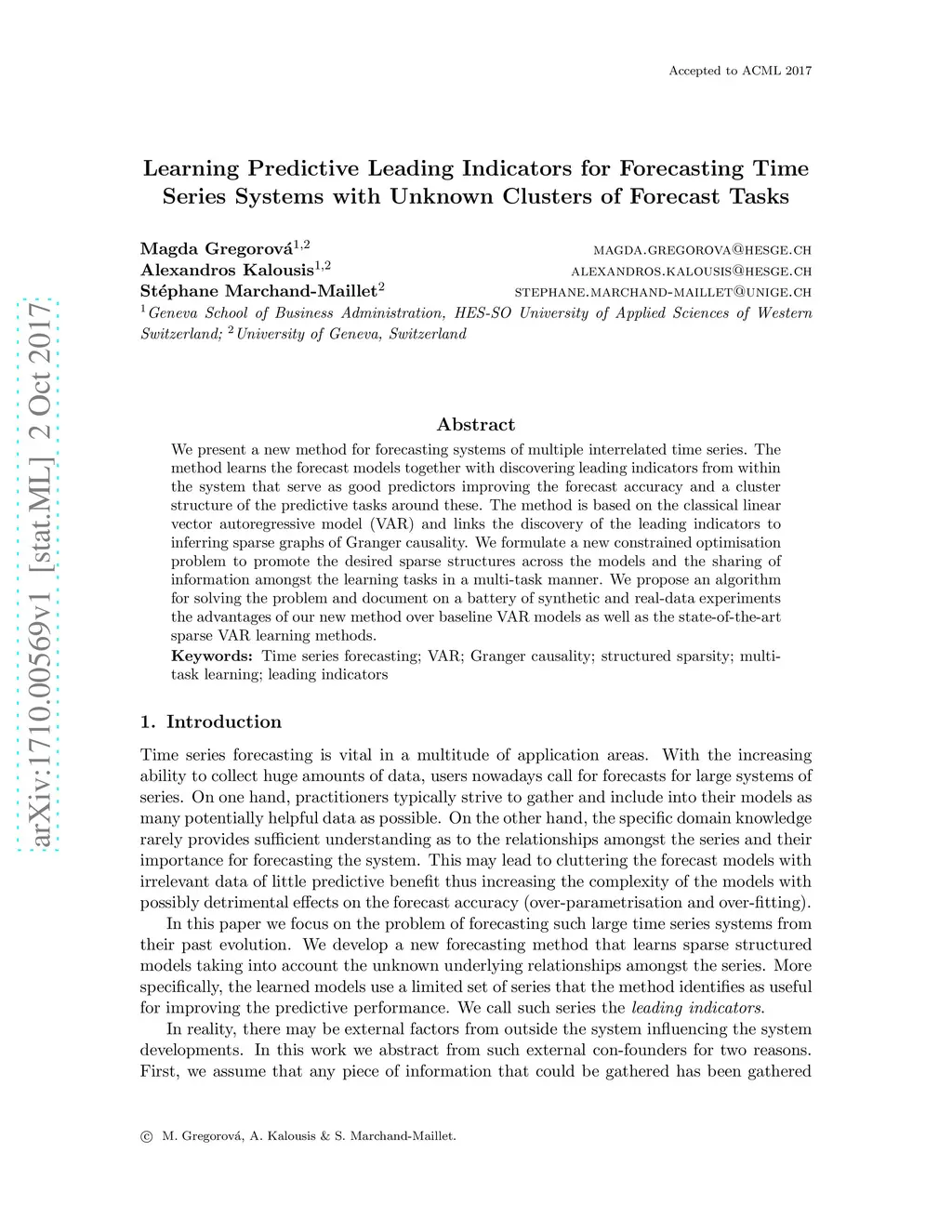 We present a new method for forecasting systems of multiple interrelated time series. The method learns the forecast models together with discovering leading indicators from within the system that serve as good predictors improving the forecast accuracy and a cluster structure of the predictive tasks around these. The method is based on the classical linear vector autoregressive model (VAR) and links the discovery of the leading indicators to inferring sparse graphs of Granger causality. We formulate a new constrained optimisation problem to promote the desired sparse structures across the models and the sharing of information amongst the learning tasks in a multi-task manner. We propose an algorithm for solving the problem and document on a battery of synthetic and real-data experiments the advantages of our new method over baseline VAR models as well as the state-of-the-art sparse VAR learning methods.
