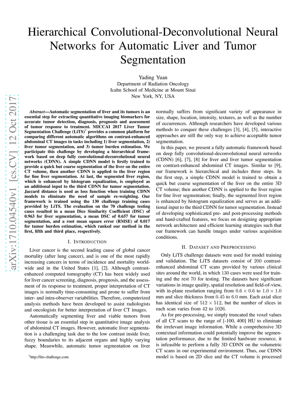 Automatic segmentation of liver and its tumors is an essential step for extracting quantitative imaging biomarkers for accurate tumor detection, diagnosis, prognosis and assessment of tumor response to treatment. MICCAI 2017 Liver Tumor Segmentation Challenge (LiTS) provides a common platform for comparing different automatic algorithms on contrast-enhanced abdominal CT images in tasks including 1) liver segmentation, 2) liver tumor segmentation, and 3) tumor burden estimation. We participate this challenge by developing a hierarchical framework based on deep fully convolutional-deconvolutional neural networks (CDNN). A simple CDNN model is firstly trained to provide a quick but coarse segmentation of the liver on the entire CT volume, then another CDNN is applied to the liver region for fine liver segmentation. At last, the segmented liver region, which is enhanced by histogram equalization, is employed as an additional input to the third CDNN for tumor segmentation. Jaccard distance is used as loss function when training CDNN models to eliminate the need of sample re-weighting. Our framework is trained using the 130 challenge training cases provided by LiTS. The evaluation on the 70 challenge testing cases resulted in a mean Dice Similarity Coefficient (DSC) of 0.963 for liver segmentation, a mean DSC of 0.657 for tumor segmentation, and a root mean square error (RMSE) of 0.017 for tumor burden estimation, which ranked our method in the first, fifth and third place, respectively