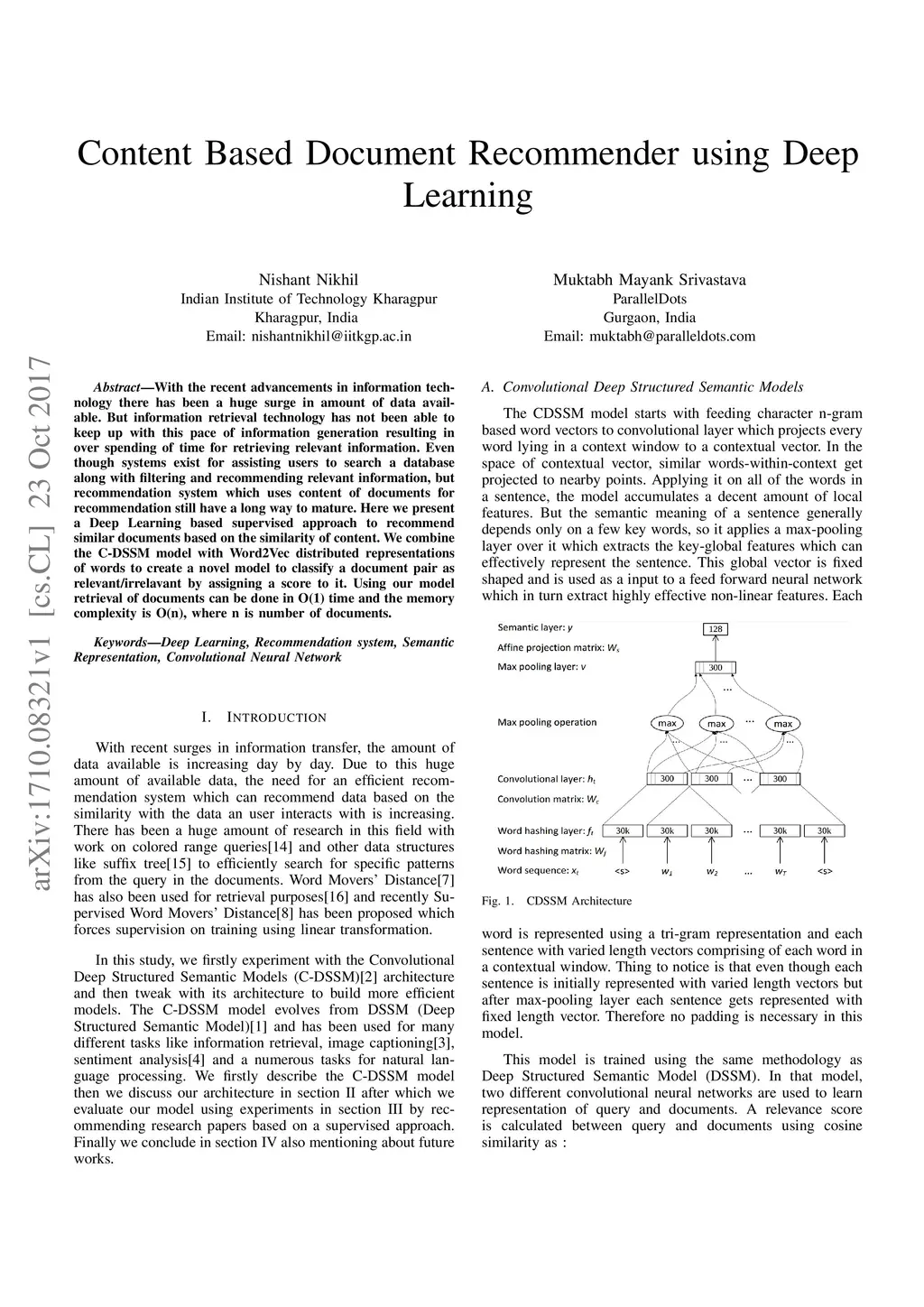 With the recent advancements in information technology there has been a huge surge in amount of data available. But information retrieval technology has not been able to keep up with this pace of information generation resulting in over spending of time for retrieving relevant information. Even though systems exist for assisting users to search a database along with filtering and recommending relevant information, but recommendation system which uses content of documents for recommendation still have a long way to mature. Here we present a Deep Learning based supervised approach to recommend similar documents based on the similarity of content. We combine the C-DSSM model with Word2Vec distributed representations of words to create a novel model to classify a document pair as relevant/irrelavant by assigning a score to it. Using our model retrieval of documents can be done in O(1) time and the memory complexity is O(n), where n is number of documents.