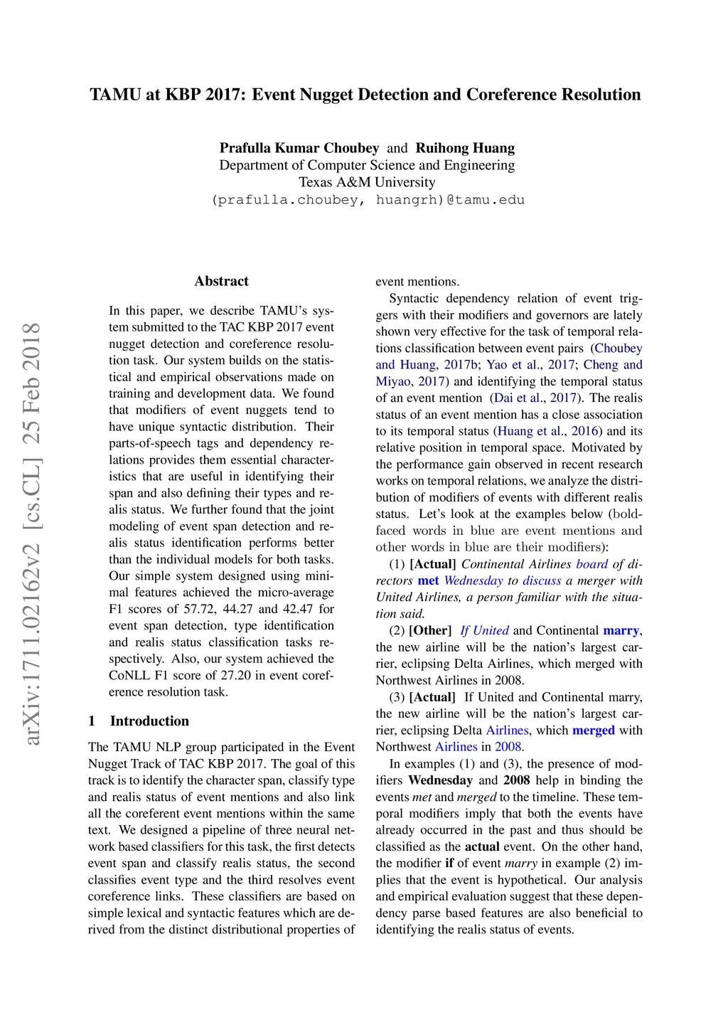 In this paper, we describe TAMU's system submitted to the TAC KBP 2017 event nugget detection and coreference resolution task. Our system builds on the statistical and empirical observations made on training and development data. We found that modifiers of event nuggets tend to have unique syntactic distribution. Their parts-of-speech tags and dependency relations provides them essential characteristics that are useful in identifying their span and also defining their types and realis status. We further found that the joint modeling of event span detection and realis status identification performs better than the individual models for both tasks. Our simple system designed using minimal features achieved the micro-average F1 scores of 57.72, 44.27 and 42.47 for event span detection, type identification and realis status classification tasks respectively. Also, our system achieved the CoNLL F1 score of 27.20 in event coreference resolution task.