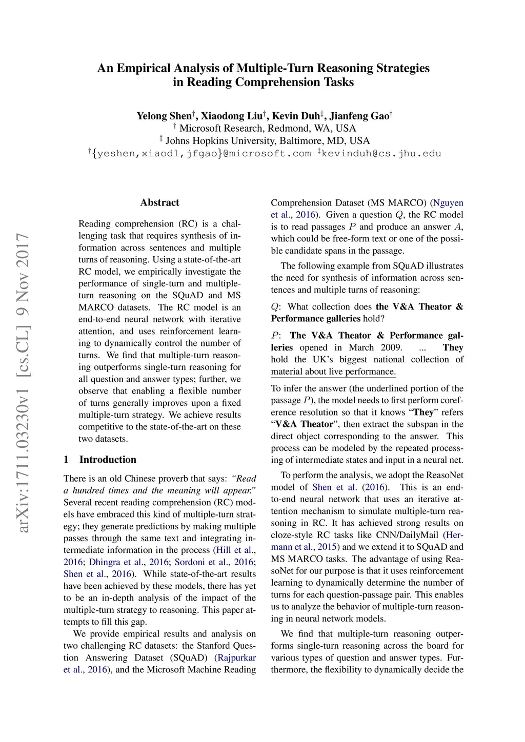 Reading comprehension (RC) is a challenging task that requires synthesis of information across sentences and multiple turns of reasoning. Using a state-of-the-art RC model, we empirically investigate the performance of single-turn and multiple-turn reasoning on the SQuAD and MS MARCO datasets. The RC model is an end-to-end neural network with iterative attention, and uses reinforcement learning to dynamically control the number of turns. We find that multiple-turn reasoning outperforms single-turn reasoning for all question and answer types; further, we observe that enabling a flexible number of turns generally improves upon a fixed multiple-turn strategy. %across all question types, and is particularly beneficial to questions with lengthy, descriptive answers. We achieve results competitive to the state-of-the-art on these two datasets.