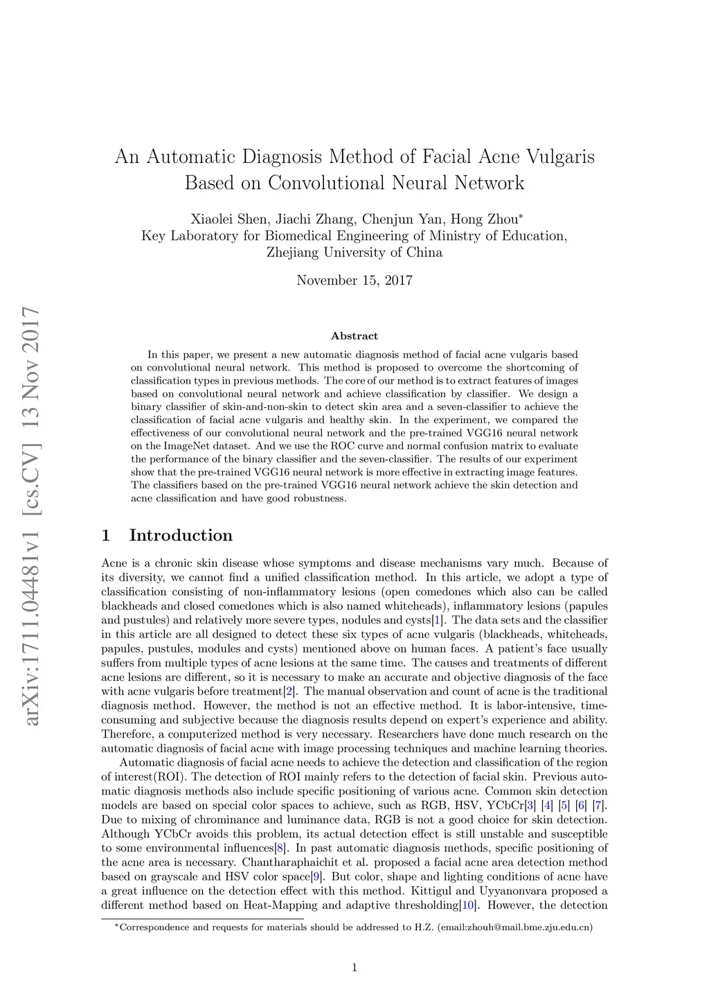 In this paper, we present a new automatic diagnosis method of facial acne vulgaris based on convolutional neural network. This method is proposed to overcome the shortcoming of classification types in previous methods. The core of our method is to extract features of images based on convolutional neural network and achieve classification by classifier. We design a binary classifier of skin-and-non-skin to detect skin area and a seven-classifier to achieve the classification of facial acne vulgaris and healthy skin. In the experiment, we compared the effectiveness of our convolutional neural network and the pre-trained VGG16 neural network on the ImageNet dataset. And we use the ROC curve and normal confusion matrix to evaluate the performance of the binary classifier and the seven-classifier. The results of our experiment show that the pre-trained VGG16 neural network is more effective in extracting image features. The classifiers based on the pre-trained VGG16 neural network achieve the skin detection and acne classification and have good robustness.