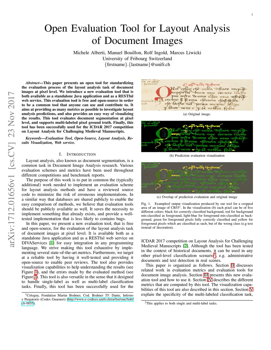 This paper presents an open tool for standardizing the evaluation process of the layout analysis task of document images at pixel level. We introduce a new evaluation tool that is both available as a standalone Java application and as a RESTful web service. This evaluation tool is free and open-source in order to be a common tool that anyone can use and contribute to. It aims at providing as many metrics as possible to investigate layout analysis predictions, and also provide an easy way of visualizing the results. This tool evaluates document segmentation at pixel level, and support multi-labeled pixel ground truth. Finally, this tool has been successfully used for the ICDAR2017 competition on Layout Analysis for Challenging Medieval Manuscripts.