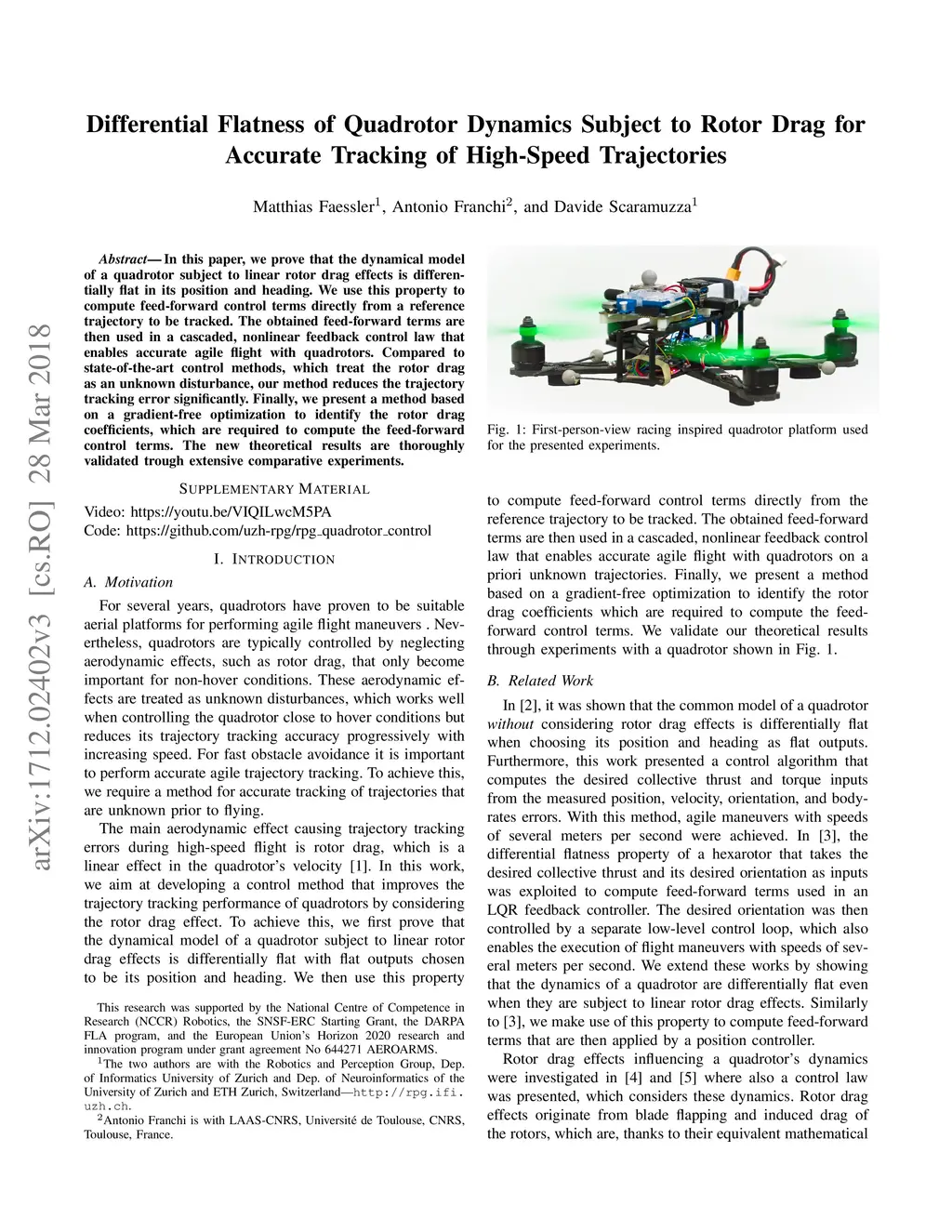 In this paper, we prove that the dynamical model of a quadrotor subject to linear rotor drag effects is differentially flat in its position and heading. We use this property to compute feed-forward control terms directly from a reference trajectory to be tracked. The obtained feed-forward terms are then used in a cascaded, nonlinear feedback control law that enables accurate agile flight with quadrotors. Compared to state-of-the-art control methods, which treat the rotor drag as an unknown disturbance, our method reduces the trajectory tracking error significantly. Finally, we present a method based on a gradient-free optimization to identify the rotor drag coefficients, which are required to compute the feed-forward control terms. The new theoretical results are thoroughly validated trough extensive comparative experiments.