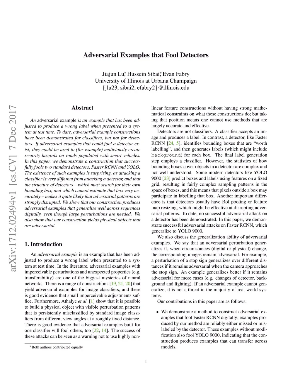 An adversarial example is an example that has been adjusted to produce a wrong label when presented to a system at test time. To date, adversarial example constructions have been demonstrated for classifiers, but not for detectors. If adversarial examples that could fool a detector exist, they could be used to (for example) maliciously create security hazards on roads populated with smart vehicles. In this paper, we demonstrate a construction that successfully fools two standard detectors, Faster RCNN and YOLO. The existence of such examples is surprising, as attacking a classifier is very different from attacking a detector, and that the structure of detectors - which must search for their own bounding box, and which cannot estimate that box very accurately - makes it quite likely that adversarial patterns are strongly disrupted. We show that our construction produces adversarial examples that generalize well across sequences digitally, even though large perturbations are needed. We also show that our construction yields physical objects that are adversarial.