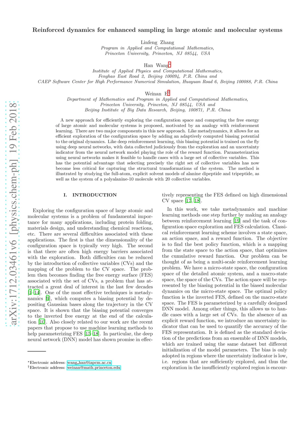 A new approach for efficiently exploring the configuration space and computing the free energy of large atomic and molecular systems is proposed, motivated by an analogy with reinforcement learning. There are two major components in this new approach. Like metadynamics, it allows for an efficient exploration of the configuration space by adding an adaptively computed biasing potential to the original dynamics. Like deep reinforcement learning, this biasing potential is trained on the fly using deep neural networks, with data collected judiciously from the exploration and an uncertainty indicator from the neural network model playing the role of the reward function. Parameterization using neural networks makes it feasible to handle cases with a large set of collective variables. This has the potential advantage that selecting precisely the right set of collective variables has now become less critical for capturing the structural transformations of the system. The method is illustrated by studying the full-atom, explicit solvent models of alanine dipeptide and tripeptide, as well as the system of a polyalanine-10 molecule with 20 collective variables.