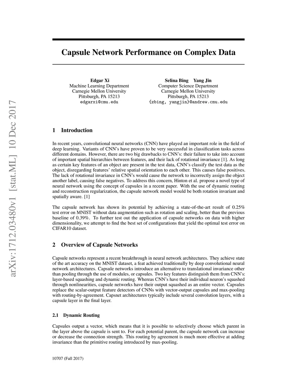 In recent years, convolutional neural networks (CNN) have played an important role in the field of deep learning. Variants of CNN's have proven to be very successful in classification tasks across different domains. However, there are two big drawbacks to CNN's: their failure to take into account of important spatial hierarchies between features, and their lack of rotational invariance. As long as certain key features of an object are present in the test data, CNN's classify the test data as the object, disregarding features' relative spatial orientation to each other. This causes false positives. The lack of rotational invariance in CNN's would cause the network to incorrectly assign the object another label, causing false negatives. To address this concern, Hinton et al. propose a novel type of neural network using the concept of capsules in a recent paper. With the use of dynamic routing and reconstruction regularization, the capsule network model would be both rotation invariant and spatially aware. The capsule network has shown its potential by achieving a state-of-the-art result of 0.25% test error on MNIST without data augmentation such as rotation and scaling, better than the previous baseline of 0.39%. To further test out the application of capsule networks on data with higher dimensionality, we attempt to find the best set of configurations that yield the optimal test error on CIFAR10 dataset.