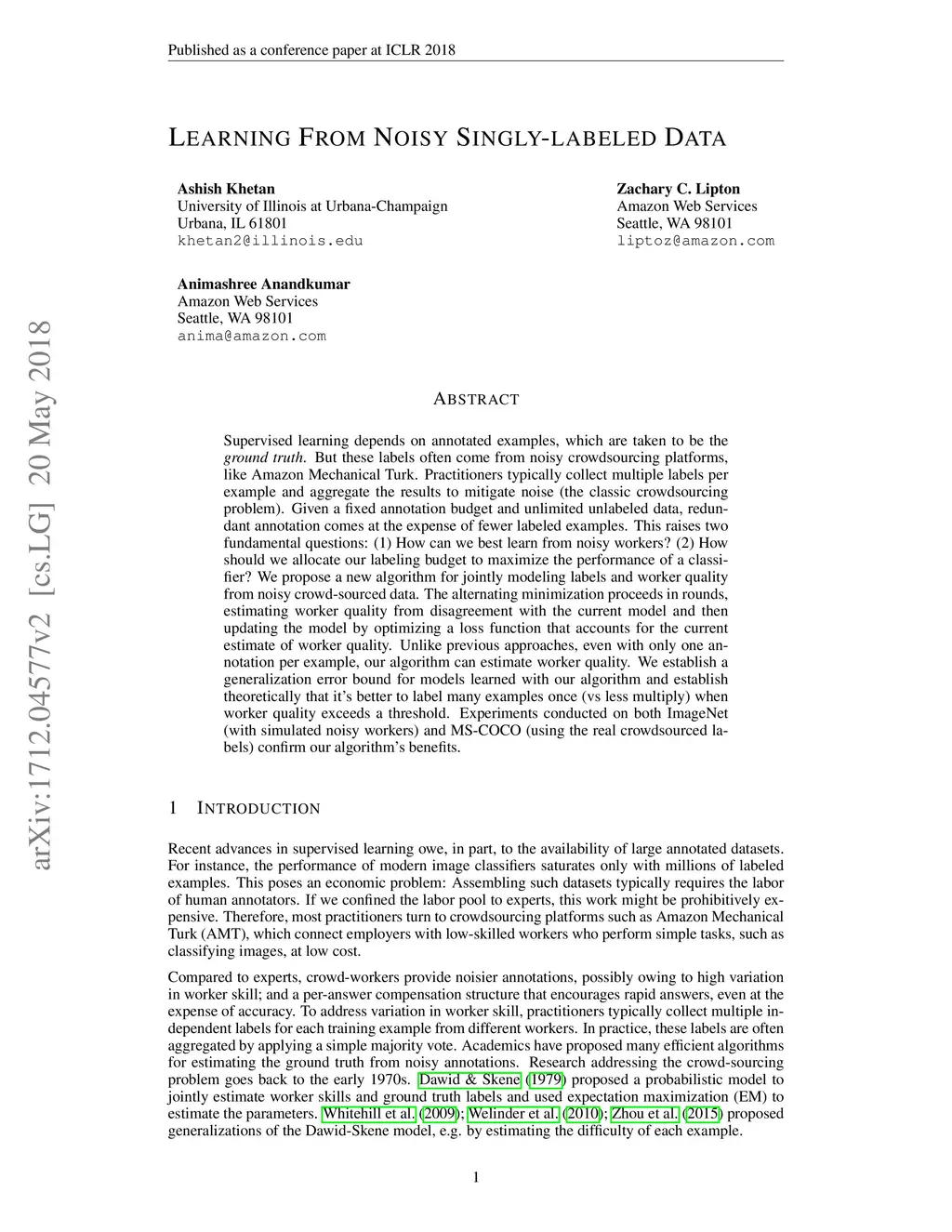 Supervised learning depends on annotated examples, which are taken to be the \emph{ground truth}. But these labels often come from noisy crowdsourcing platforms, like Amazon Mechanical Turk. Practitioners typically collect multiple labels per example and aggregate the results to mitigate noise (the classic crowdsourcing problem). Given a fixed annotation budget and unlimited unlabeled data, redundant annotation comes at the expense of fewer labeled examples. This raises two fundamental questions: (1) How can we best learn from noisy workers? (2) How should we allocate our labeling budget to maximize the performance of a classifier? We propose a new algorithm for jointly modeling labels and worker quality from noisy crowd-sourced data. The alternating minimization proceeds in rounds, estimating worker quality from disagreement with the current model and then updating the model by optimizing a loss function that accounts for the current estimate of worker quality. Unlike previous approaches, even with only one annotation per example, our algorithm can estimate worker quality. We establish a generalization error bound for models learned with our algorithm and establish theoretically that it's better to label many examples once (vs less multiply) when worker quality is above a threshold. Experiments conducted on both ImageNet (with simulated noisy workers) and MS-COCO (using the real crowdsourced labels) confirm our algorithm's benefits.