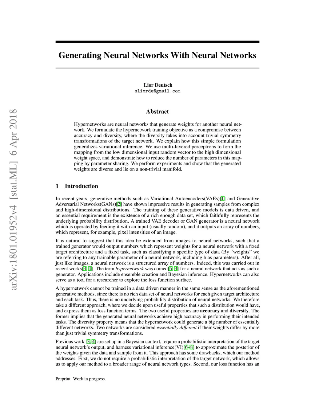 Hypernetworks are neural networks that generate weights for another neural network. We formulate the hypernetwork training objective as a compromise between accuracy and diversity, where the diversity takes into account trivial symmetry transformations of the target network. We explain how this simple formulation generalizes variational inference. We use multi-layered perceptrons to form the mapping from the low dimensional input random vector to the high dimensional weight space, and demonstrate how to reduce the number of parameters in this mapping by parameter sharing. We perform experiments and show that the generated weights are diverse and lie on a non-trivial manifold.
