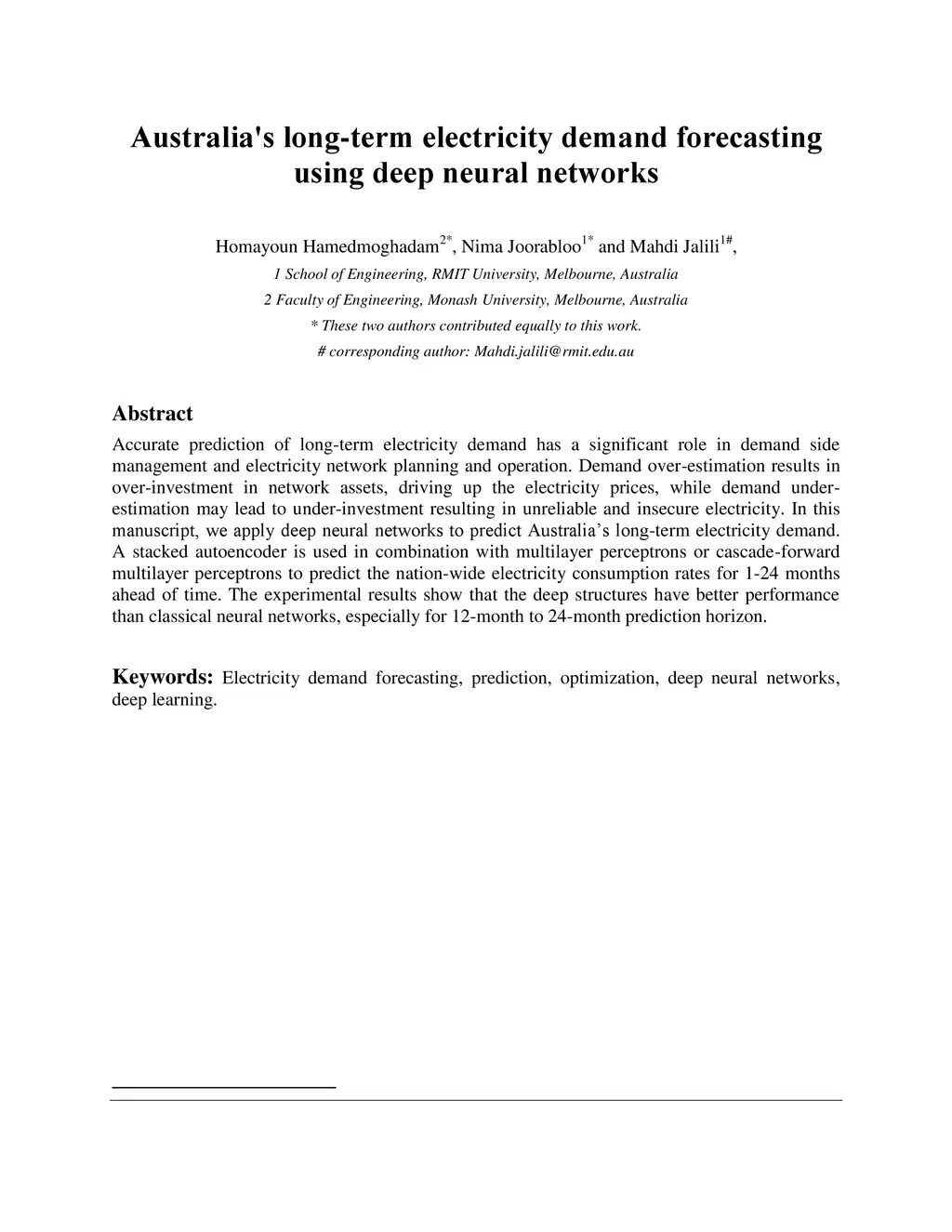 Accurate prediction of long-term electricity demand has a significant role in demand side management and electricity network planning and operation. Demand over-estimation results in over-investment in network assets, driving up the electricity prices, while demand under-estimation may lead to under-investment resulting in unreliable and insecure electricity. In this manuscript, we apply deep neural networks to predict Australia's long-term electricity demand. A stacked autoencoder is used in combination with multilayer perceptrons or cascade-forward multilayer perceptrons to predict the nation-wide electricity consumption rates for 1-24 months ahead of time. The experimental results show that the deep structures have better performance than classical neural networks, especially for 12-month to 24-month prediction horizon.