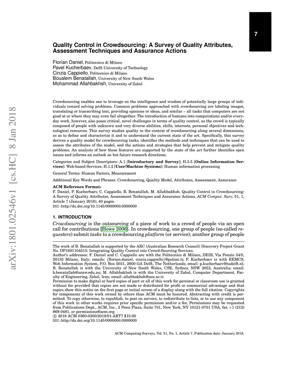 Crowdsourcing enables one to leverage on the intelligence and wisdom of potentially large groups of individuals toward solving problems. Common problems approached with crowdsourcing are labeling images, translating or transcribing text, providing opinions or ideas, and similar - all tasks that computers are not good at or where they may even fail altogether. The introduction of humans into computations and/or everyday work, however, also poses critical, novel challenges in terms of quality control, as the crowd is typically composed of people with unknown and very diverse abilities, skills, interests, personal objectives and technological resources. This survey studies quality in the context of crowdsourcing along several dimensions, so as to define and characterize it and to understand the current state of the art. Specifically, this survey derives a quality model for crowdsourcing tasks, identifies the methods and techniques that can be used to assess the attributes of the model, and the actions and strategies that help prevent and mitigate quality problems. An analysis of how these features are supported by the state of the art further identifies open issues and informs an outlook on hot future research directions.
