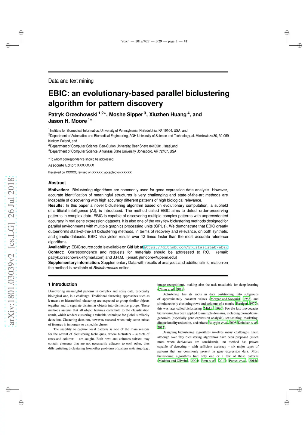 In this paper a novel biclustering algorithm based on artificial intelligence (AI) is introduced. The method called EBIC aims to detect biologically meaningful, order-preserving patterns in complex data. The proposed algorithm is probably the first one capable of discovering with accuracy exceeding 50% multiple complex patterns in real gene expression datasets. It is also one of the very few biclustering methods designed for parallel environments with multiple graphics processing units (GPUs). We demonstrate that EBIC outperforms state-of-the-art biclustering methods, in terms of recovery and relevance, on both synthetic and genetic datasets. EBIC also yields results over 12 times faster than the most accurate reference algorithms. The proposed algorithm is anticipated to be added to the repertoire of unsupervised machine learning algorithms for the analysis of datasets, including those from large-scale genomic studies.