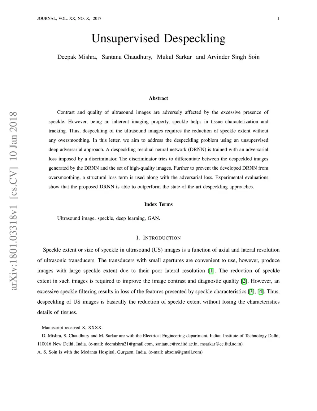 Unsupervised Despeckling