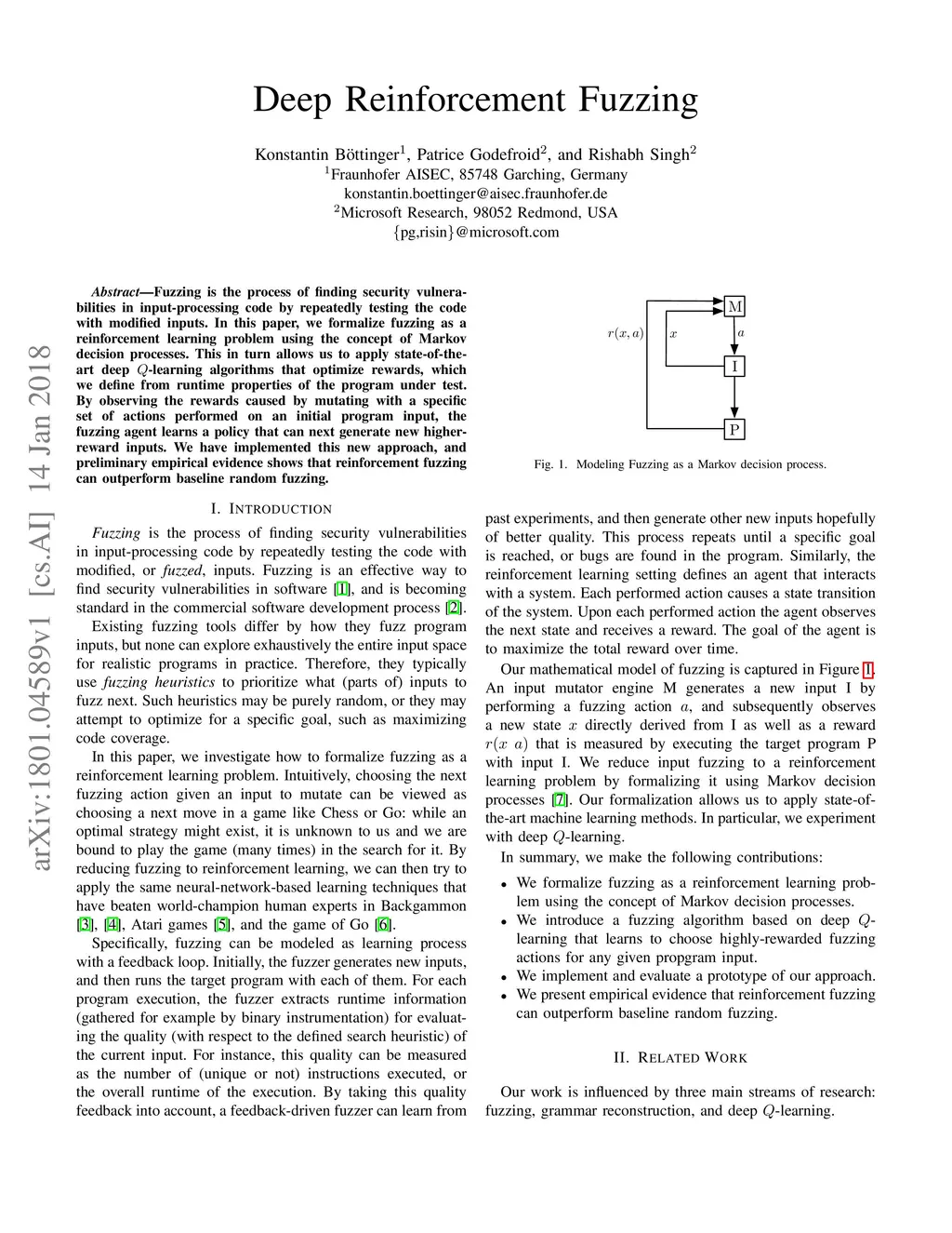 Fuzzing is the process of finding security vulnerabilities in input-processing code by repeatedly testing the code with modified inputs. In this paper, we formalize fuzzing as a reinforcement learning problem using the concept of Markov decision processes. This in turn allows us to apply state-of-the-art deep Q-learning algorithms that optimize rewards, which we define from runtime properties of the program under test. By observing the rewards caused by mutating with a specific set of actions performed on an initial program input, the fuzzing agent learns a policy that can next generate new higher-reward inputs. We have implemented this new approach, and preliminary empirical evidence shows that reinforcement fuzzing can outperform baseline random fuzzing.