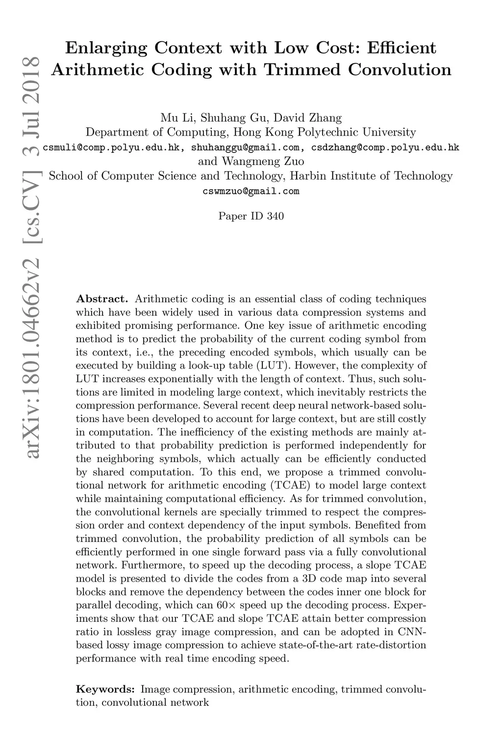 Arithmetic coding is an essential class of coding techniques. One key issue of arithmetic encoding method is to predict the probability of the current coding symbol from its context, i.e., the preceding encoded symbols, which usually can be executed by building a look-up table (LUT). However, the complexity of LUT increases exponentially with the length of context. Thus, such solutions are limited to modeling large context, which inevitably restricts the compression performance. Several recent deep neural network-based solutions have been developed to account for large context, but are still costly in computation. The inefficiency of the existing methods are mainly attributed to that probability prediction is performed independently for the neighboring symbols, which actually can be efficiently conducted by shared computation. To this end, we propose a trimmed convolutional network for arithmetic encoding (TCAE) to model large context while maintaining computational efficiency. As for trimmed convolution, the convolutional kernels are specially trimmed to respect the compression order and context dependency of the input symbols. Benefited from trimmed convolution, the probability prediction of all symbols can be efficiently performed in one single forward pass via a fully convolutional network. Furthermore, to speed up the decoding process, a slope TCAE model is presented to divide the codes from a 3D code map into several blocks and remove the dependency between the codes inner one block for parallel decoding, which can 60x speed up the decoding process. Experiments show that our TCAE and slope TCAE attain better compression ratio in lossless gray image compression, and can be adopted in CNN-based lossy image compression to achieve state-of-the-art rate-distortion performance with real-time encoding speed.