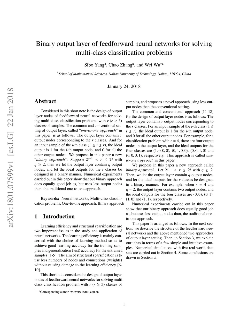 Considered in this short note is the design of output layer nodes of feedforward neural networks for solving multi-class classification problems with r (bigger than or equal to 3) classes of samples. The common and conventional setting of output layer, called "one-to-one approach" in this paper, is as follows: The output layer contains r output nodes corresponding to the r classes. And for an input sample of the i-th class, the ideal output is 1 for the i-th output node, and 0 for all the other output nodes. We propose in this paper a new "binary approach": Suppose r is (2^(q minus 1), 2^q] with q bigger than or equal to 2, then we let the output layer contain q output nodes, and let the ideal outputs for the r classes be designed in a binary manner. Numerical experiments carried out in this paper show that our binary approach does equally good job as, but uses less output nodes than, the traditional one-to-one approach.