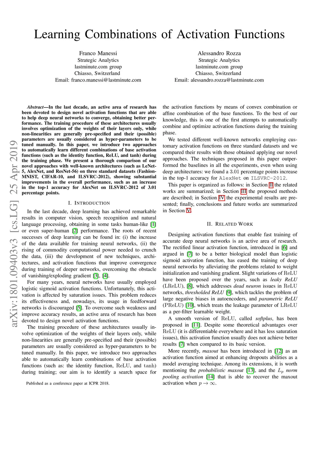 In the last decade, an active area of research has been devoted to design novel activation functions that are able to help deep neural networks to converge, obtaining better performance. The training procedure of these architectures usually involves optimization of the weights of their layers only, while non-linearities are generally pre-specified and their (possible) parameters are usually considered as hyper-parameters to be tuned manually. In this paper, we introduce two approaches to automatically learn different combinations of base activation functions (such as the identity function, ReLU, and tanh) during the training phase. We present a thorough comparison of our novel approaches with well-known architectures (such as LeNet-5, AlexNet, and ResNet-56) on three standard datasets (Fashion-MNIST, CIFAR-10, and ILSVRC-2012), showing substantial improvements in the overall performance, such as an increase in the top-1 accuracy for AlexNet on ILSVRC-2012 of 3.01 percentage points.