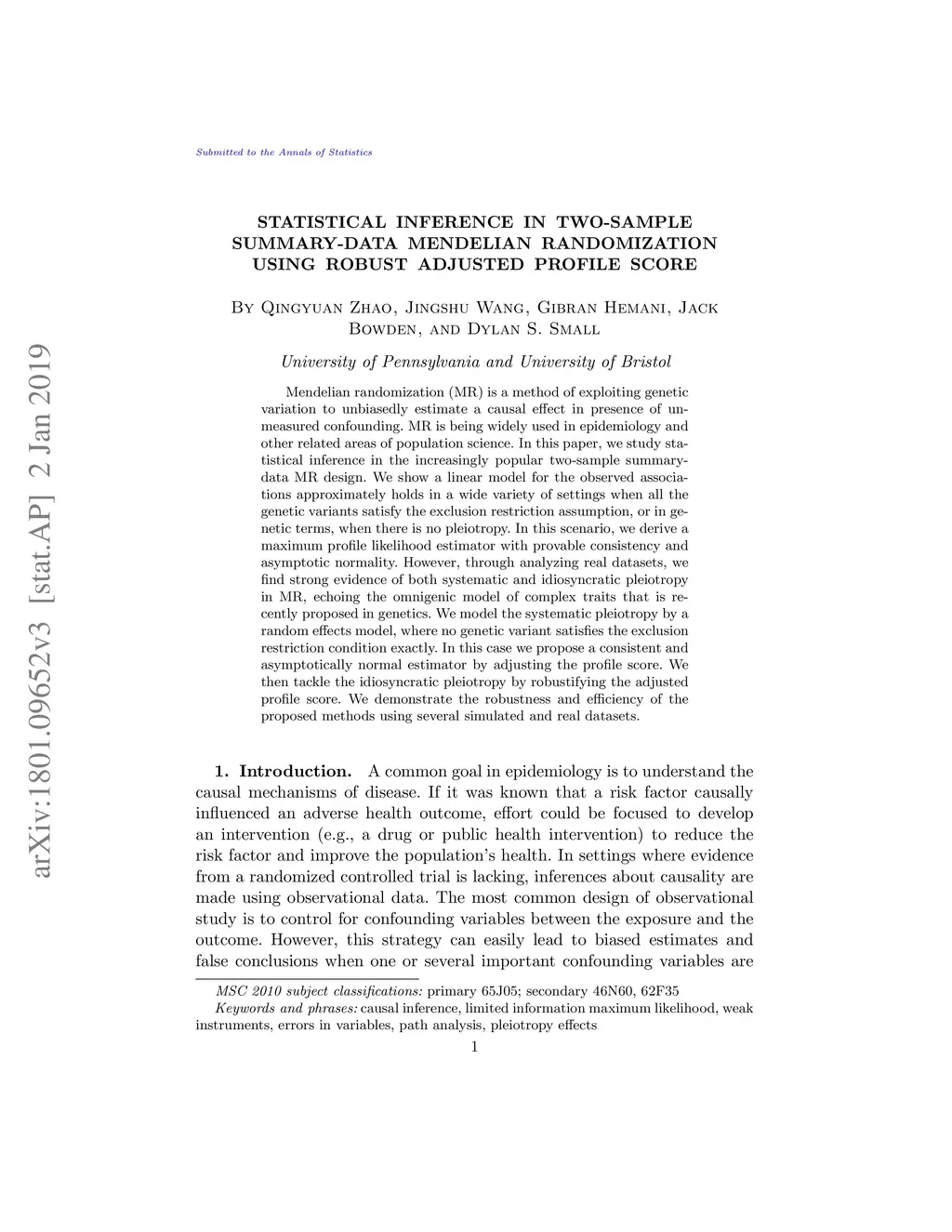 Mendelian randomization (MR) is a method of exploiting genetic variation to unbiasedly estimate a causal effect in presence of unmeasured confounding. MR is being widely used in epidemiology and other related areas of population science. In this paper, we study statistical inference in the increasingly popular two-sample summary-data MR design. We show a linear model for the observed associations approximately holds in a wide variety of settings when all the genetic variants satisfy the exclusion restriction assumption, or in genetic terms, when there is no pleiotropy. In this scenario, we derive a maximum profile likelihood estimator with provable consistency and asymptotic normality. However, through analyzing real datasets, we find strong evidence of both systematic and idiosyncratic pleiotropy in MR, echoing the omnigenic model of complex traits that is recently proposed in genetics. We model the systematic pleiotropy by a random effects model, where no genetic variant satisfies the exclusion restriction condition exactly. In this case we propose a consistent and asymptotically normal estimator by adjusting the profile score. We then tackle the idiosyncratic pleiotropy by robustifying the adjusted profile score. We demonstrate the robustness and efficiency of the proposed methods using several simulated and real datasets.