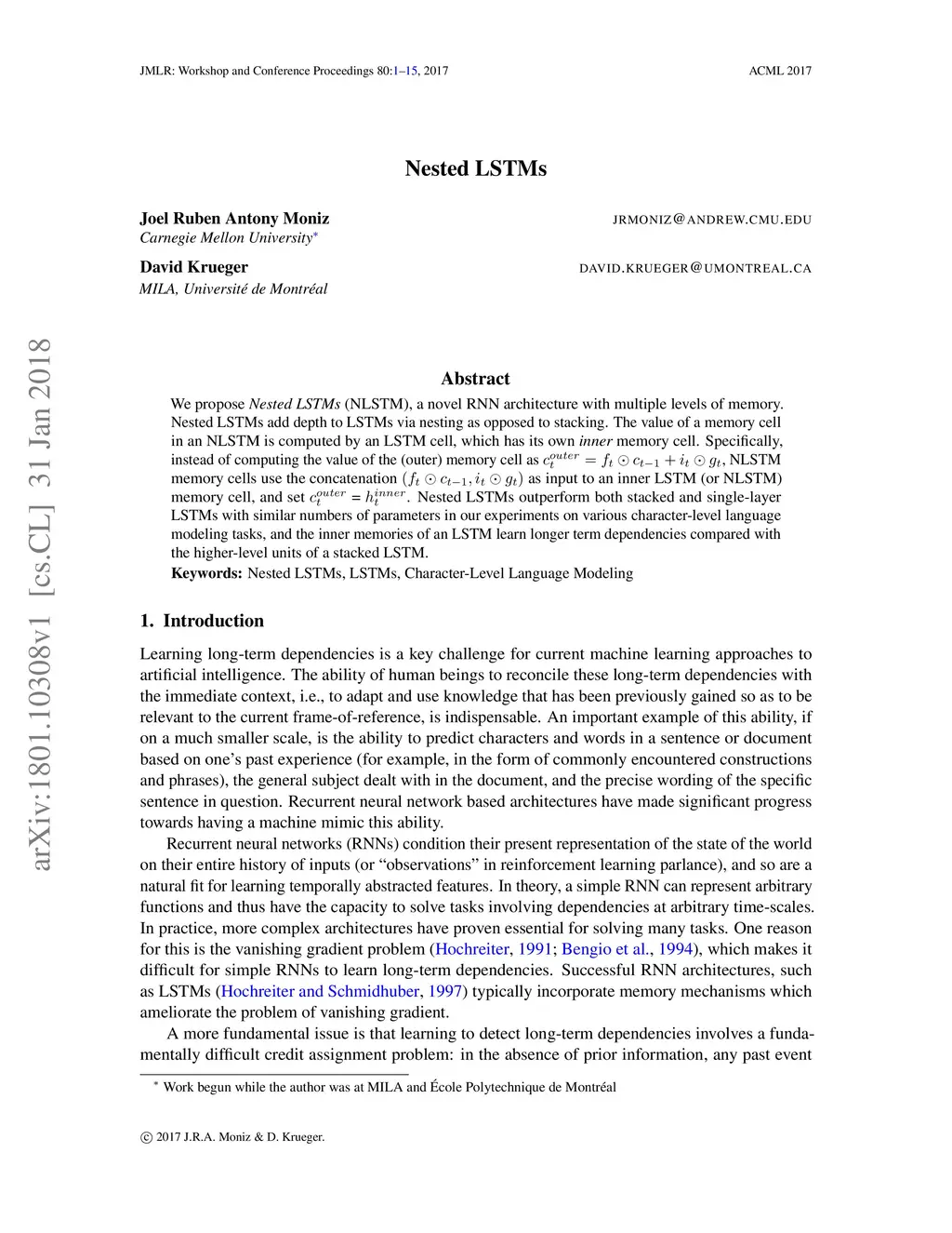 We propose Nested LSTMs (NLSTM), a novel RNN architecture with multiple levels of memory. Nested LSTMs add depth to LSTMs via nesting as opposed to stacking. The value of a memory cell in an NLSTM is computed by an LSTM cell, which has its own inner memory cell. Specifically, instead of computing the value of the (outer) memory cell as , NLSTM memory cells use the concatenation as input to an inner LSTM (or NLSTM) memory cell, and set = . Nested LSTMs outperform both stacked and single-layer LSTMs with similar numbers of parameters in our experiments on various character-level language modeling tasks, and the inner memories of an LSTM learn longer term dependencies compared with the higher-level units of a stacked LSTM.