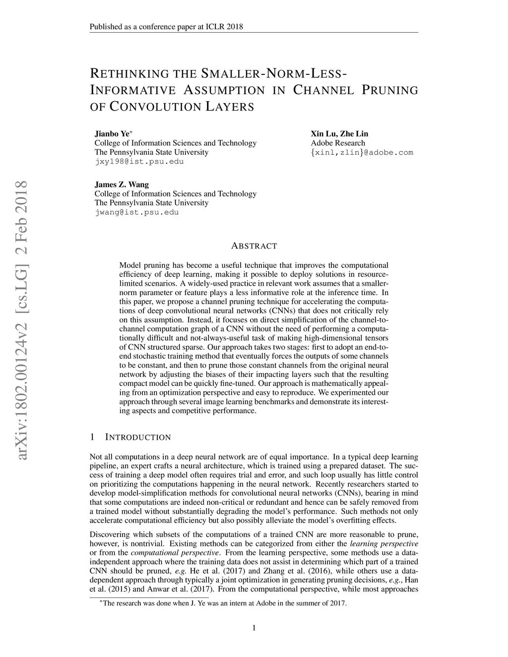 Model pruning has become a useful technique that improves the computational efficiency of deep learning, making it possible to deploy solutions in resource-limited scenarios. A widely-used practice in relevant work assumes that a smaller-norm parameter or feature plays a less informative role at the inference time. In this paper, we propose a channel pruning technique for accelerating the computations of deep convolutional neural networks (CNNs) that does not critically rely on this assumption. Instead, it focuses on direct simplification of the channel-to-channel computation graph of a CNN without the need of performing a computationally difficult and not-always-useful task of making high-dimensional tensors of CNN structured sparse. Our approach takes two stages: first to adopt an end-to- end stochastic training method that eventually forces the outputs of some channels to be constant, and then to prune those constant channels from the original neural network by adjusting the biases of their impacting layers such that the resulting compact model can be quickly fine-tuned. Our approach is mathematically appealing from an optimization perspective and easy to reproduce. We experimented our approach through several image learning benchmarks and demonstrate its interesting aspects and competitive performance.