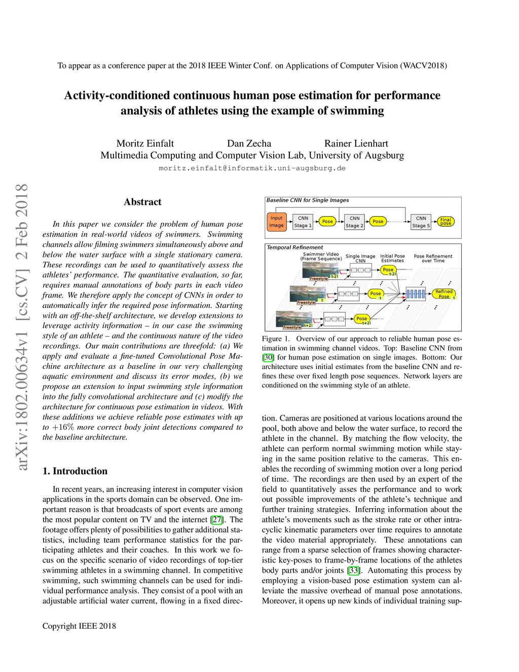 In this paper we consider the problem of human pose estimation in real-world videos of swimmers. Swimming channels allow filming swimmers simultaneously above and below the water surface with a single stationary camera. These recordings can be used to quantitatively assess the athletes' performance. The quantitative evaluation, so far, requires manual annotations of body parts in each video frame. We therefore apply the concept of CNNs in order to automatically infer the required pose information. Starting with an off-the-shelf architecture, we develop extensions to leverage activity information - in our case the swimming style of an athlete - and the continuous nature of the video recordings. Our main contributions are threefold: (a) We apply and evaluate a fine-tuned Convolutional Pose Machine architecture as a baseline in our very challenging aquatic environment and discuss its error modes, (b) we propose an extension to input swimming style information into the fully convolutional architecture and (c) modify the architecture for continuous pose estimation in videos. With these additions we achieve reliable pose estimates with up to +16% more correct body joint detections compared to the baseline architecture.
