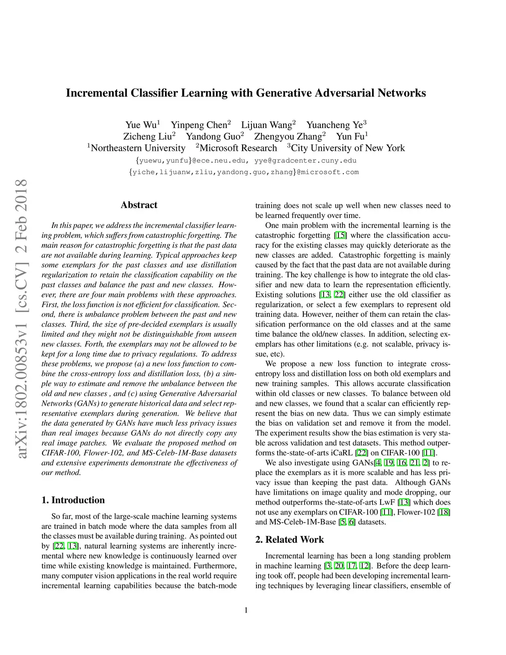 In this paper, we address the incremental classifier learning problem, which suffers from catastrophic forgetting. The main reason for catastrophic forgetting is that the past data are not available during learning. Typical approaches keep some exemplars for the past classes and use distillation regularization to retain the classification capability on the past classes and balance the past and new classes. However, there are four main problems with these approaches. First, the loss function is not efficient for classification. Second, there is unbalance problem between the past and new classes. Third, the size of pre-decided exemplars is usually limited and they might not be distinguishable from unseen new classes. Forth, the exemplars may not be allowed to be kept for a long time due to privacy regulations. To address these problems, we propose (a) a new loss function to combine the cross-entropy loss and distillation loss, (b) a simple way to estimate and remove the unbalance between the old and new classes , and (c) using Generative Adversarial Networks (GANs) to generate historical data and select representative exemplars during generation. We believe that the data generated by GANs have much less privacy issues than real images because GANs do not directly copy any real image patches. We evaluate the proposed method on CIFAR-100, Flower-102, and MS-Celeb-1M-Base datasets and extensive experiments demonstrate the effectiveness of our method.