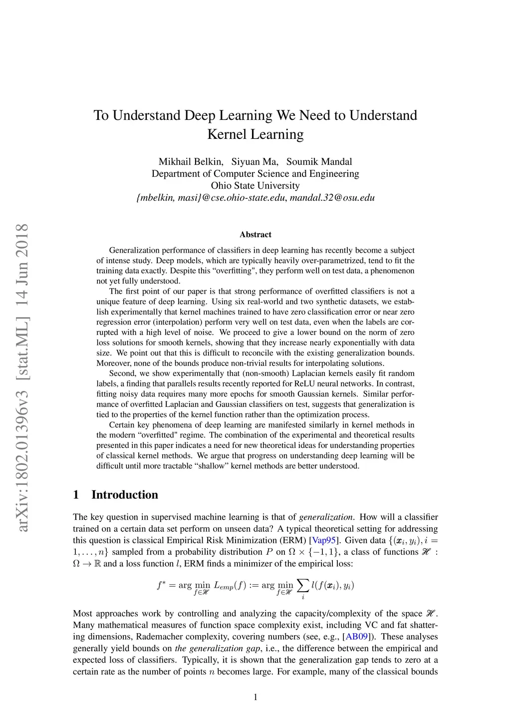 Generalization performance of classifiers in deep learning has recently become a subject of intense study. Deep models, typically over-parametrized, tend to fit the training data exactly. Despite this "overfitting", they perform well on test data, a phenomenon not yet fully understood. The first point of our paper is that strong performance of overfitted classifiers is not a unique feature of deep learning. Using six real-world and two synthetic datasets, we establish experimentally that kernel machines trained to have zero classification or near zero regression error perform very well on test data, even when the labels are corrupted with a high level of noise. We proceed to give a lower bound on the norm of zero loss solutions for smooth kernels, showing that they increase nearly exponentially with data size. We point out that this is difficult to reconcile with the existing generalization bounds. Moreover, none of the bounds produce non-trivial results for interpolating solutions. Second, we show experimentally that (non-smooth) Laplacian kernels easily fit random labels, a finding that parallels results for ReLU neural networks. In contrast, fitting noisy data requires many more epochs for smooth Gaussian kernels. Similar performance of overfitted Laplacian and Gaussian classifiers on test, suggests that generalization is tied to the properties of the kernel function rather than the optimization process. Certain key phenomena of deep learning are manifested similarly in kernel methods in the modern "overfitted" regime. The combination of the experimental and theoretical results presented in this paper indicates a need for new theoretical ideas for understanding properties of classical kernel methods. We argue that progress on understanding deep learning will be difficult until more tractable "shallow" kernel methods are better understood.