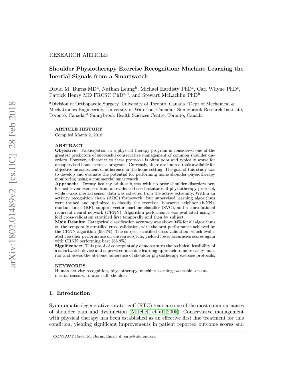 Objective: Participation in a physical therapy program is considered one of the greatest predictors of successful conservative management of common shoulder disorders. However, adherence to these protocols is often poor and typically worse for unsupervised home exercise programs. Currently, there are limited tools available for objective measurement of adherence in the home setting. The goal of this study was to develop and evaluate the potential for performing home shoulder physiotherapy monitoring using a commercial smartwatch. Approach: Twenty healthy adult subjects with no prior shoulder disorders performed seven exercises from an evidence-based rotator cuff physiotherapy protocol, while 6-axis inertial sensor data was collected from the active extremity. Within an activity recognition chain (ARC) framework, four supervised learning algorithms were trained and optimized to classify the exercises: k-nearest neighbor (k-NN), random forest (RF), support vector machine classifier (SVC), and a convolutional recurrent neural network (CRNN). Algorithm performance was evaluated using 5-fold cross-validation stratified first temporally and then by subject. Main Results: Categorical classification accuracy was above 94% for all algorithms on the temporally stratified cross validation, with the best performance achieved by the CRNN algorithm (99.4%). The subject stratified cross validation, which evaluated classifier performance on unseen subjects, yielded lower accuracies scores again with CRNN performing best (88.9%). Significance: This proof of concept study demonstrates the technical feasibility of a smartwatch device and supervised machine learning approach to more easily monitor and assess the at-home adherence of shoulder physiotherapy exercise protocols.
