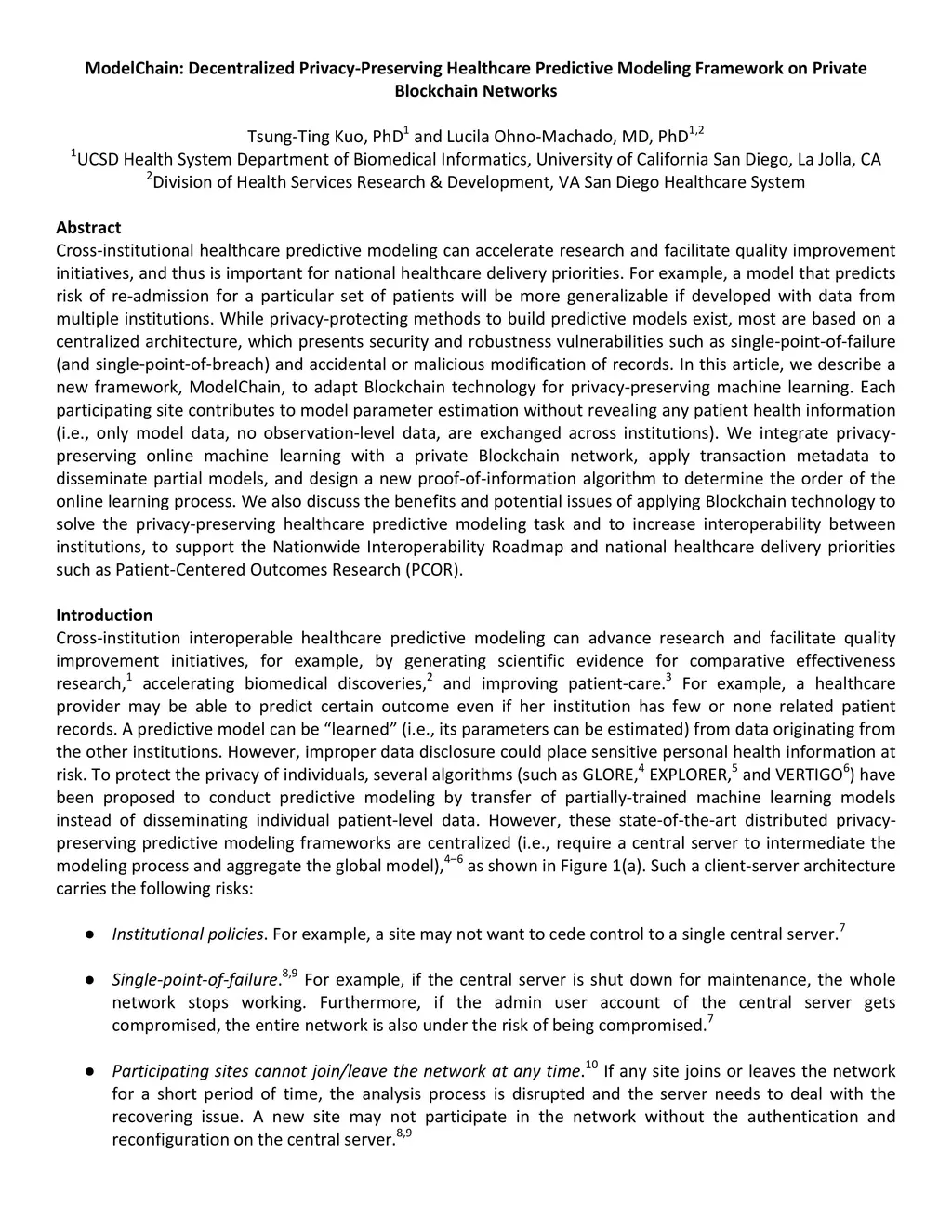 Cross-institutional healthcare predictive modeling can accelerate research and facilitate quality improvement initiatives, and thus is important for national healthcare delivery priorities. For example, a model that predicts risk of re-admission for a particular set of patients will be more generalizable if developed with data from multiple institutions. While privacy-protecting methods to build predictive models exist, most are based on a centralized architecture, which presents security and robustness vulnerabilities such as single-point-of-failure (and single-point-of-breach) and accidental or malicious modification of records. In this article, we describe a new framework, ModelChain, to adapt Blockchain technology for privacy-preserving machine learning. Each participating site contributes to model parameter estimation without revealing any patient health information (i.e., only model data, no observation-level data, are exchanged across institutions). We integrate privacy-preserving online machine learning with a private Blockchain network, apply transaction metadata to disseminate partial models, and design a new proof-of-information algorithm to determine the order of the online learning process. We also discuss the benefits and potential issues of applying Blockchain technology to solve the privacy-preserving healthcare predictive modeling task and to increase interoperability between institutions, to support the Nationwide Interoperability Roadmap and national healthcare delivery priorities such as Patient-Centered Outcomes Research (PCOR).
