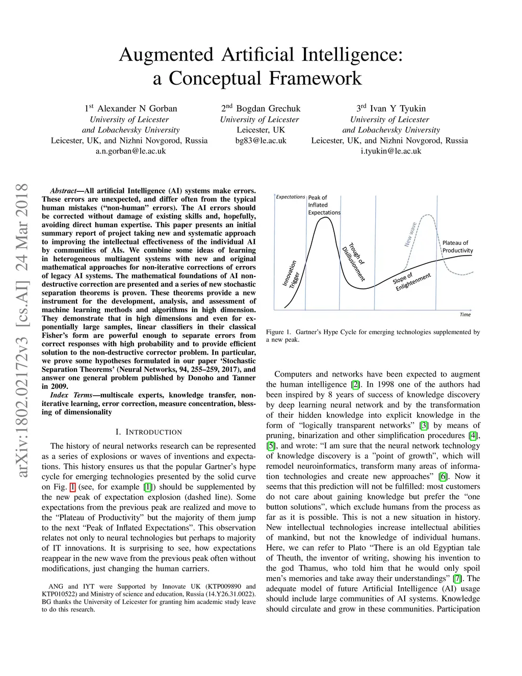 All artificial Intelligence (AI) systems make errors. These errors are unexpected, and differ often from the typical human mistakes ("non-human" errors). The AI errors should be corrected without damage of existing skills and, hopefully, avoiding direct human expertise. This paper presents an initial summary report of project taking new and systematic approach to improving the intellectual effectiveness of the individual AI by communities of AIs. We combine some ideas of learning in heterogeneous multiagent systems with new and original mathematical approaches for non-iterative corrections of errors of legacy AI systems. The mathematical foundations of AI non-destructive correction are presented and a series of new stochastic separation theorems is proven. These theorems provide a new instrument for the development, analysis, and assessment of machine learning methods and algorithms in high dimension. They demonstrate that in high dimensions and even for exponentially large samples, linear classifiers in their classical Fisher's form are powerful enough to separate errors from correct responses with high probability and to provide efficient solution to the non-destructive corrector problem. In particular, we prove some hypotheses formulated in our paper `Stochastic Separation Theorems' (Neural Networks, 94, 255--259, 2017), and answer one general problem published by Donoho and Tanner in 2009.