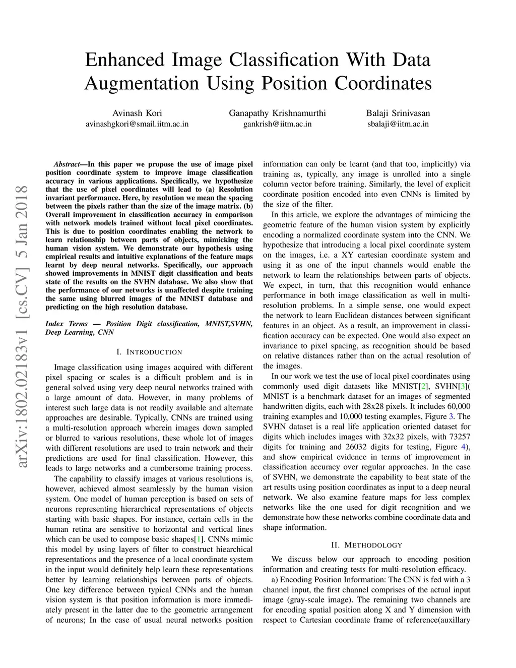 In this paper we propose the use of image pixel position coordinate system to improve image classification accuracy in various applications. Specifically, we hypothesize that the use of pixel coordinates will lead to (a) Resolution invariant performance. Here, by resolution we mean the spacing between the pixels rather than the size of the image matrix. (b) Overall improvement in classification accuracy in comparison with network models trained without local pixel coordinates. This is due to position coordinates enabling the network to learn relationship between parts of objects, mimicking the human vision system. We demonstrate our hypothesis using empirical results and intuitive explanations of the feature maps learnt by deep neural networks. Specifically, our approach showed improvements in MNIST digit classification and beats state of the results on the SVHN database. We also show that the performance of our networks is unaffected despite training the same using blurred images of the MNIST database and predicting on the high resolution database.